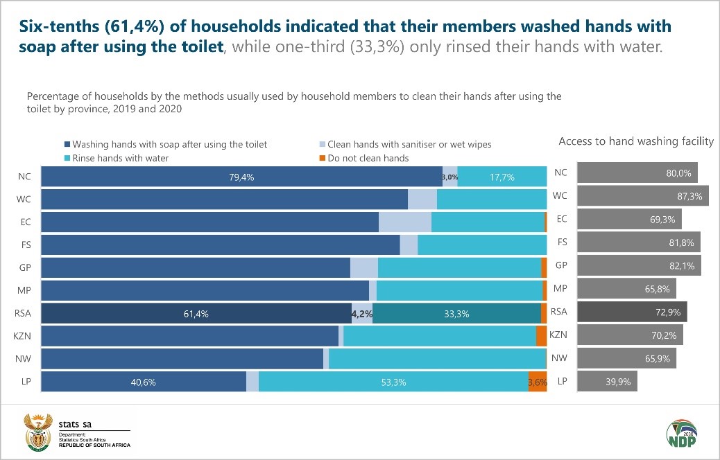 Handwashing facilities with soap and water has become a fundamental method used to prevent the spread of the virus. A comparison between 2020 and 2019 data shows that the percentage of households whose members washed their hands with soap and water after using the toilet increased from 43,6% to 61,4%, while rinsing with water decreased from 50,8% to 33,3%. It is also notable that the percentage of households whose members did not clean their hands at all decreased from 3,7% in 2019 to 1,2% in 2020.