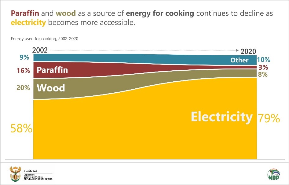 An increase in the percentage of households that used electricity for cooking, from 57,5% in 2002 to 78,5% in 2020, was accompanied by a decrease in the use of wood (20,0% to 8,1%) and paraffin (16,1% to 3,4%) over the same period. The common use of wood and coals for cooking purposes in rural provinces such as Limpopo (37,1%) and Mpumalanga (18,9%) is, however, an indication that available resources are still very accessible and, most likely, less expensive than using electricity.