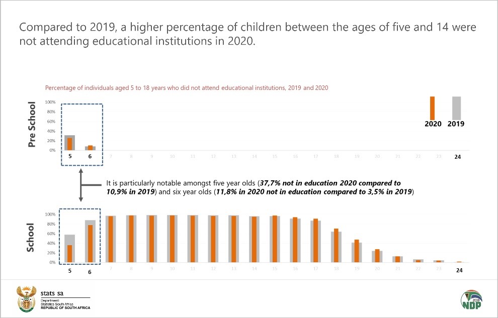 According to COVID-19 regulations, schools and educational facilities were shut down and this meant that school attendance was also negatively affected. The report shows that a much higher percentage of children aged five and six years old were not attending educational institutions in 2020 than in 2019. Five year olds who did not attend educational institutions increased from 10,9% in 2019 to 37,7% in 2020. For six year olds, the percentage increased from 3,5% to 11,8%. Although enrolment in education remained relatively high, a comparison with 2019 shows that a slightly higher percentage of children in older age groups were not attending school.