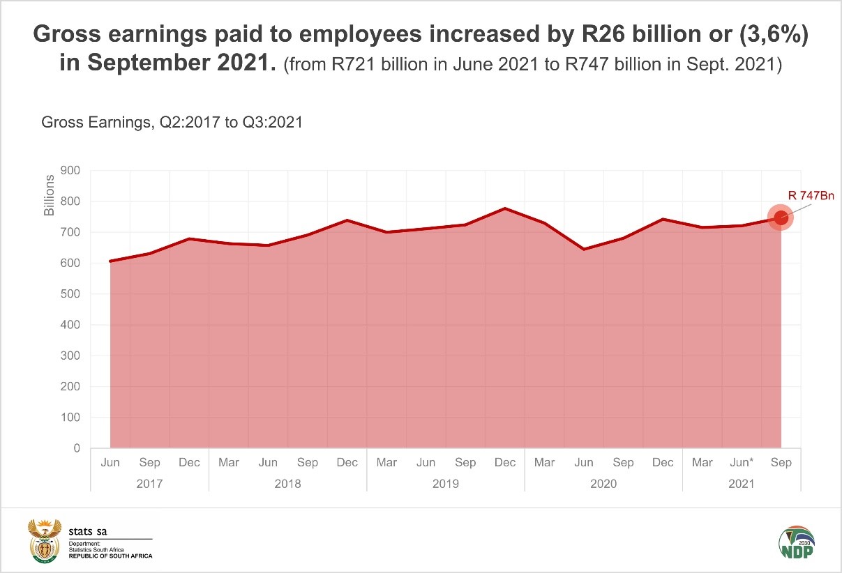 Gross earnings paid to employees increased by R26 billion (3,6%) from R721 billion in June 2021 to R747 billion in September 2021. This was largely due to increases in the following industries: community services, business services, mining, construction and manufacturing. However, there were decreases in the following industries: transport, electricity and trade.