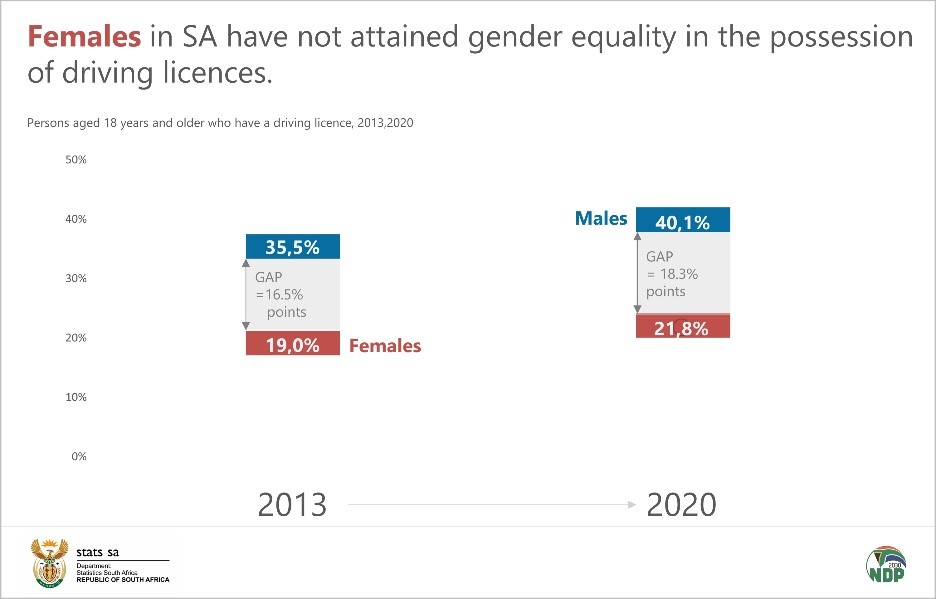 According to a new gender report, Gender Series Volume VIII: Gender patterns in Transport, 2013–2020, released by Statistics South Africa, only 21,8% of females possessed a driver’s license in 2020 compared to 40,1% of males. The possession of a driver’s licence also showed gender and racial disparities. Black Africans lagged behind all other population groups, with females from this population group recording the lowest percentage (9,6% in 2013 to 13,4% in 2020) when compared to females from other population groups.