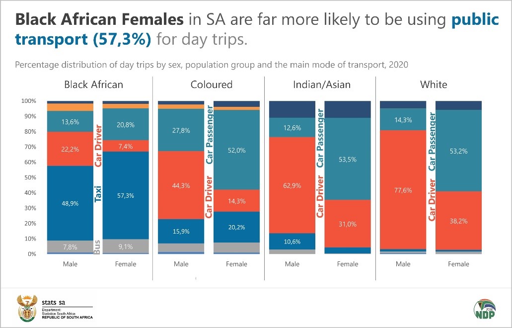 According to the report, black Africans are more likely than other population groups to use public transportation, particularly taxis, with females being more likely than males. When taking day trips, men from the coloured, Indian/Asian, and white population groups were more likely to be drivers, while women from these population groups were more likely to be passengers. On average, black Africans were relatively less likely to be drivers, though the findings are in line with the pattern observed for other population groups, where males were more likely to be drivers (22,2%) than females (7,4%).