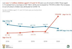 The 2020 lockdown regulations had a noticeable effect on the number of-out-school children in 2020. The disruptions created by the closures of schools and rotational attendance resulted in reduced levels of attendance. Close to one million children aged 5–18 were out-of-school. The largest number of out-of-school children was observed among children aged 5–13. The substantial increase in out-of-school children was attributed to the COVID-19 pandemic, because parents/caregivers did not want to expose their children to the virus and subsequently kept them at home. The other reason contributing to the dropout was that most educational facilities attended by children closed due to COVID-19. The highest percentage of non-attendance of schools was observed among 5- and 6-years olds (close to 38 and close 12 per cent respectively). The percentage of out-of-school children aged 5–13 was highest in the Western Cape (13,0%), followed by KwaZulu-Natal (9,1%).