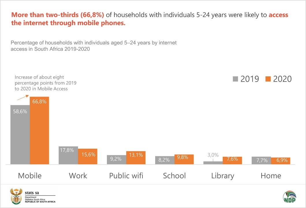An assessment of households’ readiness for remote learning in 2020 revealed a disparity in access to various resources necessary to participate in remote learning. Most households did not have digital assets such as laptops and tablets at home that would allow learners to learn remotely using digital tools. While cellphone ownership was high (91,3%) in 2020 among all households with children aged 5–24, computer ownership has remained relatively low (24,7%). Furthermore, seven out of ten (70,5%) children attending Grade 7 did not own mobile phones. In 2020, close to seven per cent of households with individuals aged 5–24 had access to the internet at home while most households accessed the internet via smart phones (66,8%). The workplace and the use of public wifi facilities were the other preferred modes of access to the internet by households with individuals aged 5–24 (15,6 and 13,1 per cent respectively).