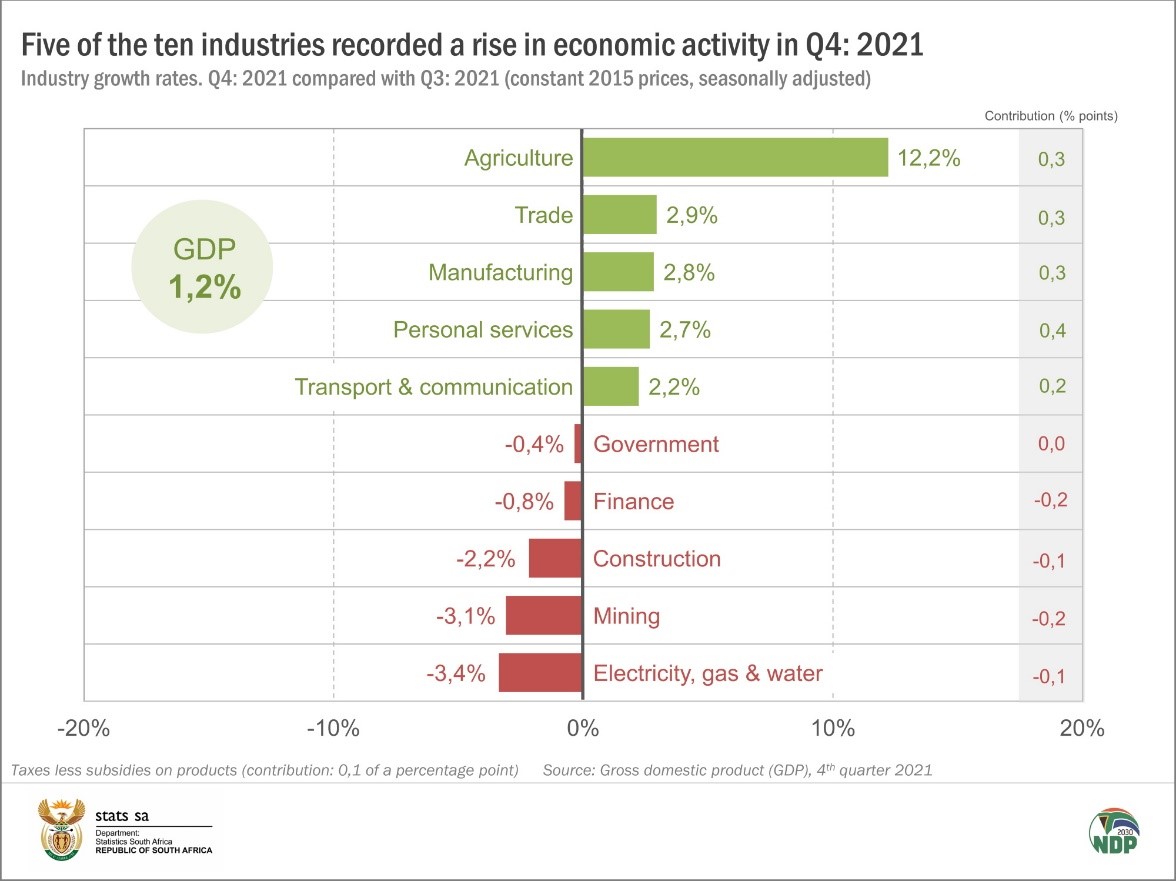 Real gross domestic product (GDP) grew by 1,2%1 in the fourth quarter (October–December), taking the annual growth rate for 2021 to 4,9%.