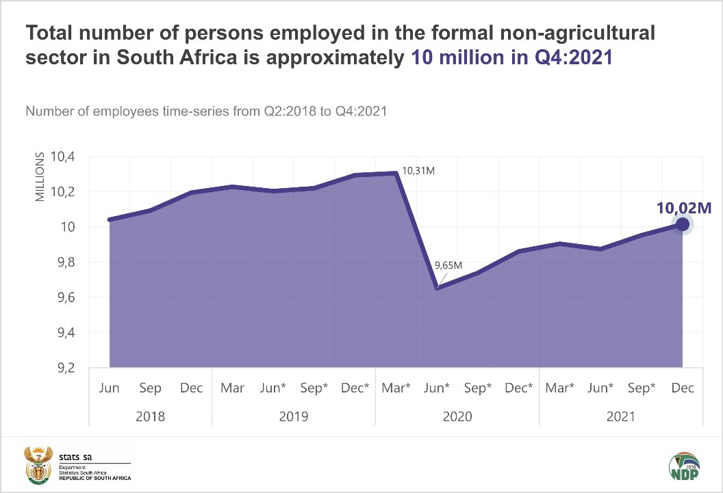Jobs in the formal non-agricultural sector increased by 62 000 in the fourth quarter of 2021, bringing the total number of persons employed in the formal non-agricultural sector in South Africa to approximately 10,0 million. According to the Quarterly Employment Statistics (QES, Q4:2021) survey released by Statistics South Africa (Stats SA), formal sector jobs increased by 154 000 year-on-year.