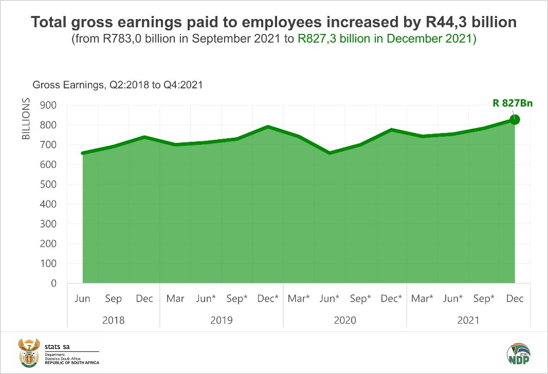 Year-on-year, total gross earnings increased by R51,7 billion or 6,7% between December 2020 and December 2021.