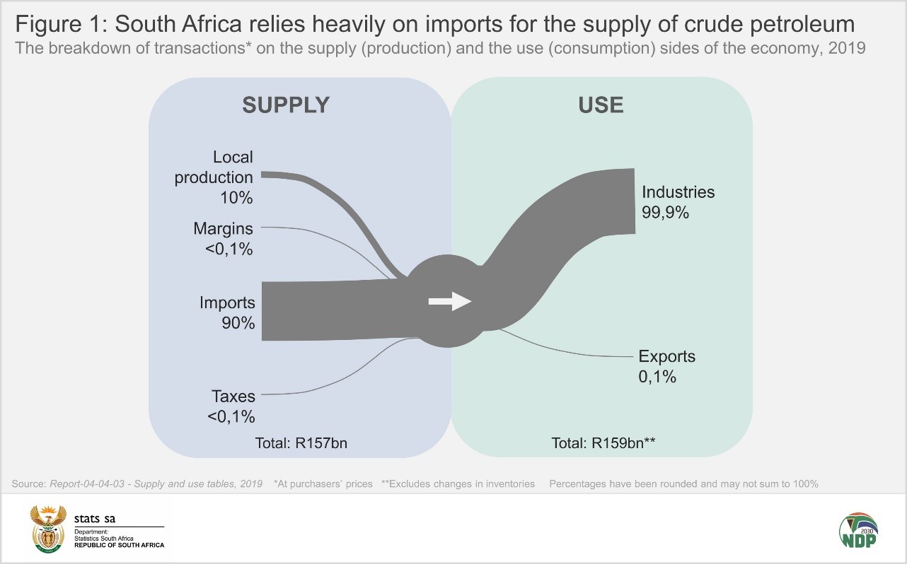 Take crude petroleum. Figure 1 tracks oil-related transactions across our economy, showing where crude petroleum comes from and where it ends up. The supply (or production) side describes how crude petroleum is brought into the economy. Almost all of supply (90%) is imported while 10% is locally produced. What this shows is that South Africa depends a lot on the international community for this resource.