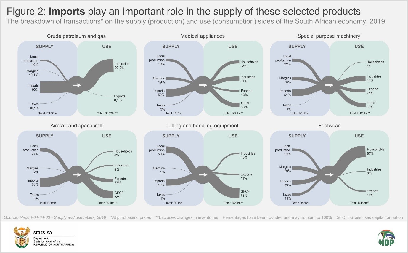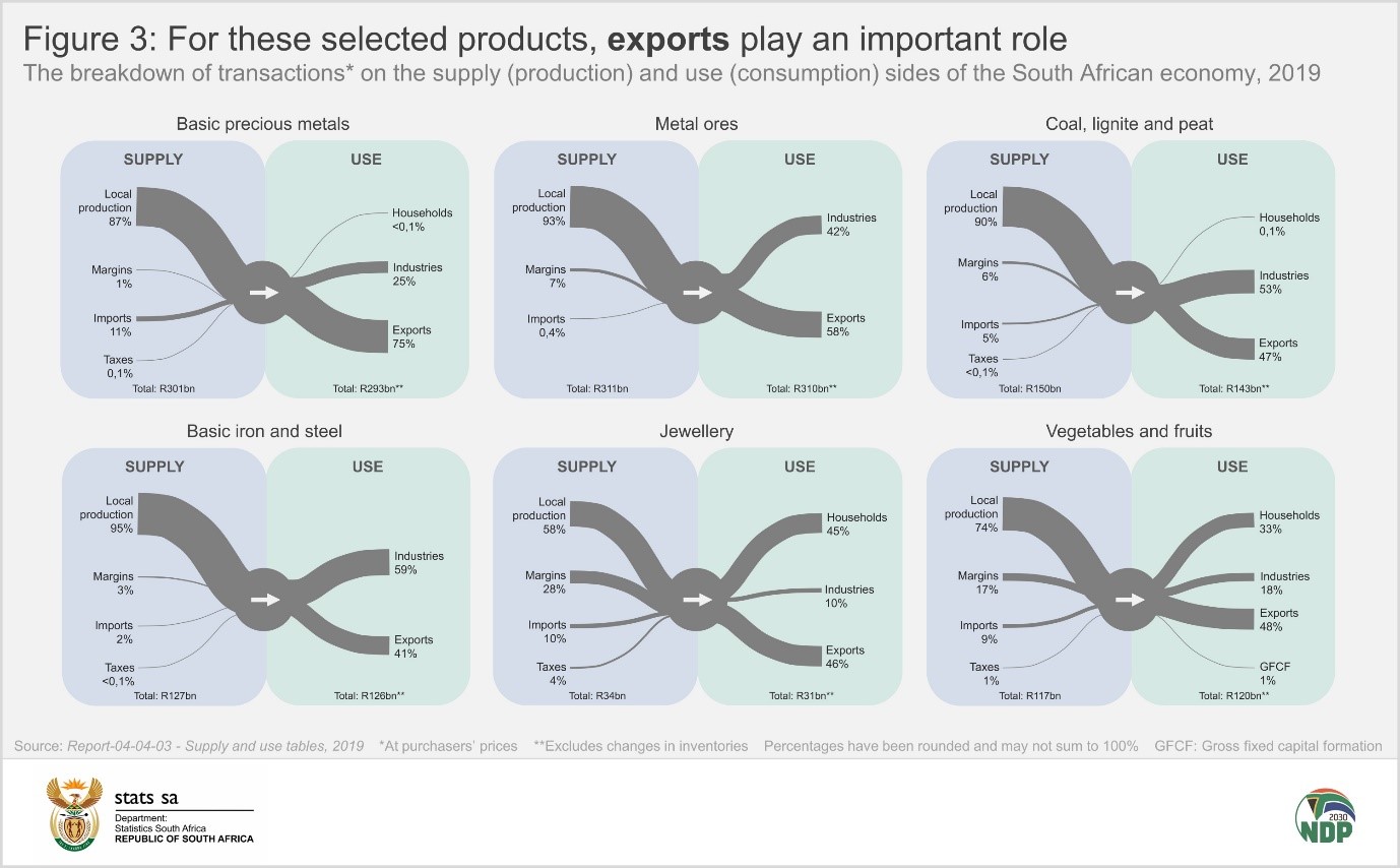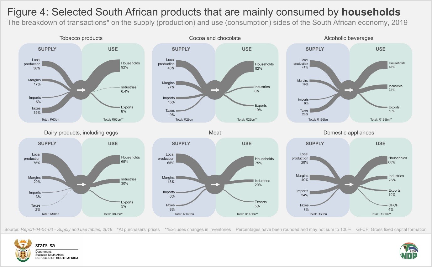 These diagrams represent data from Stats SA’s latest supply and use tables (SUTs). The SUTs provide a wealth of data on transactions in the economy, covering 108 goods and services across 124 industries.