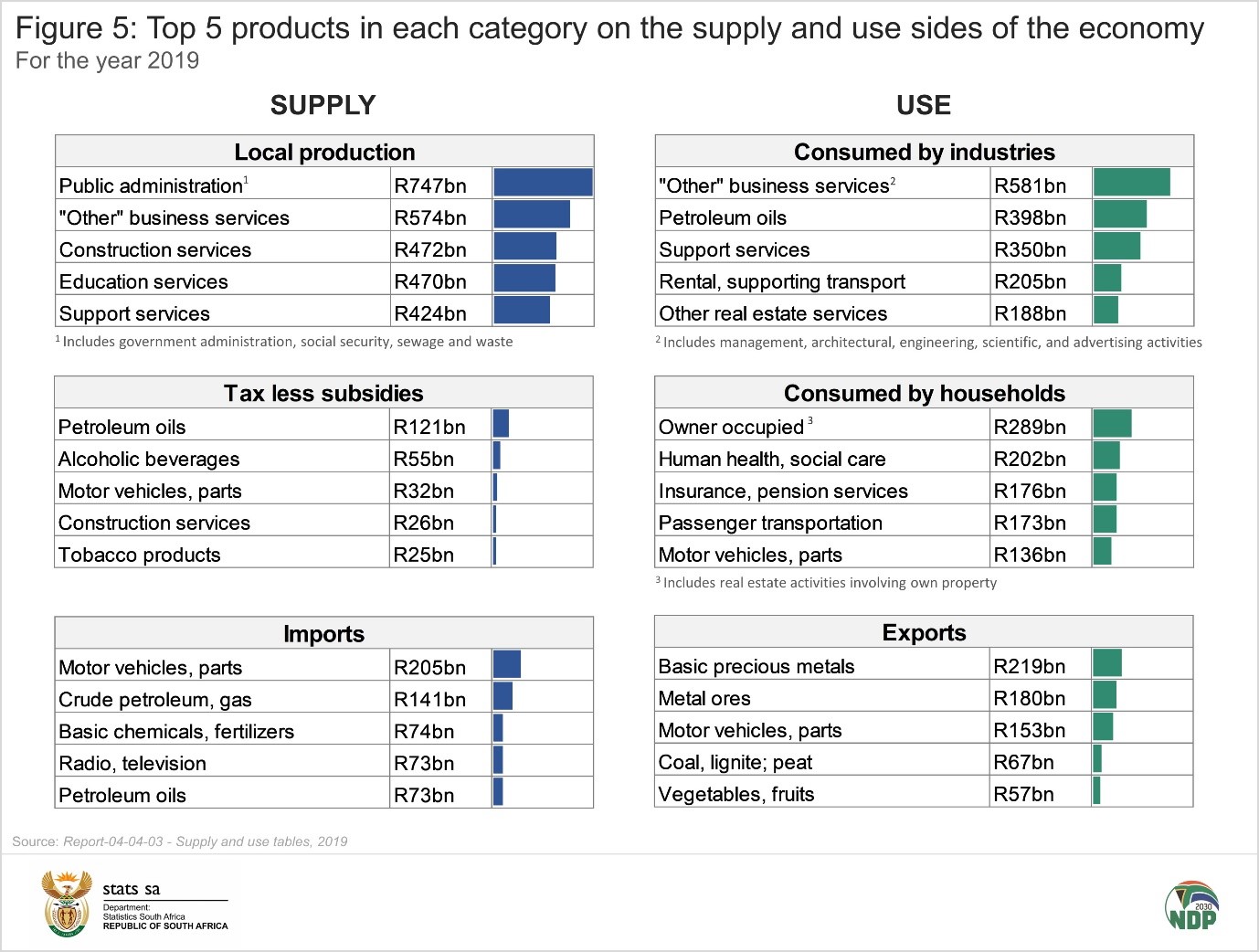 Each diagram above shows how transactions for a particular product are distributed across both sides of the economy. To get an overall picture, another way to explore the data is to rank the rand values of products against one another (Figure 5).