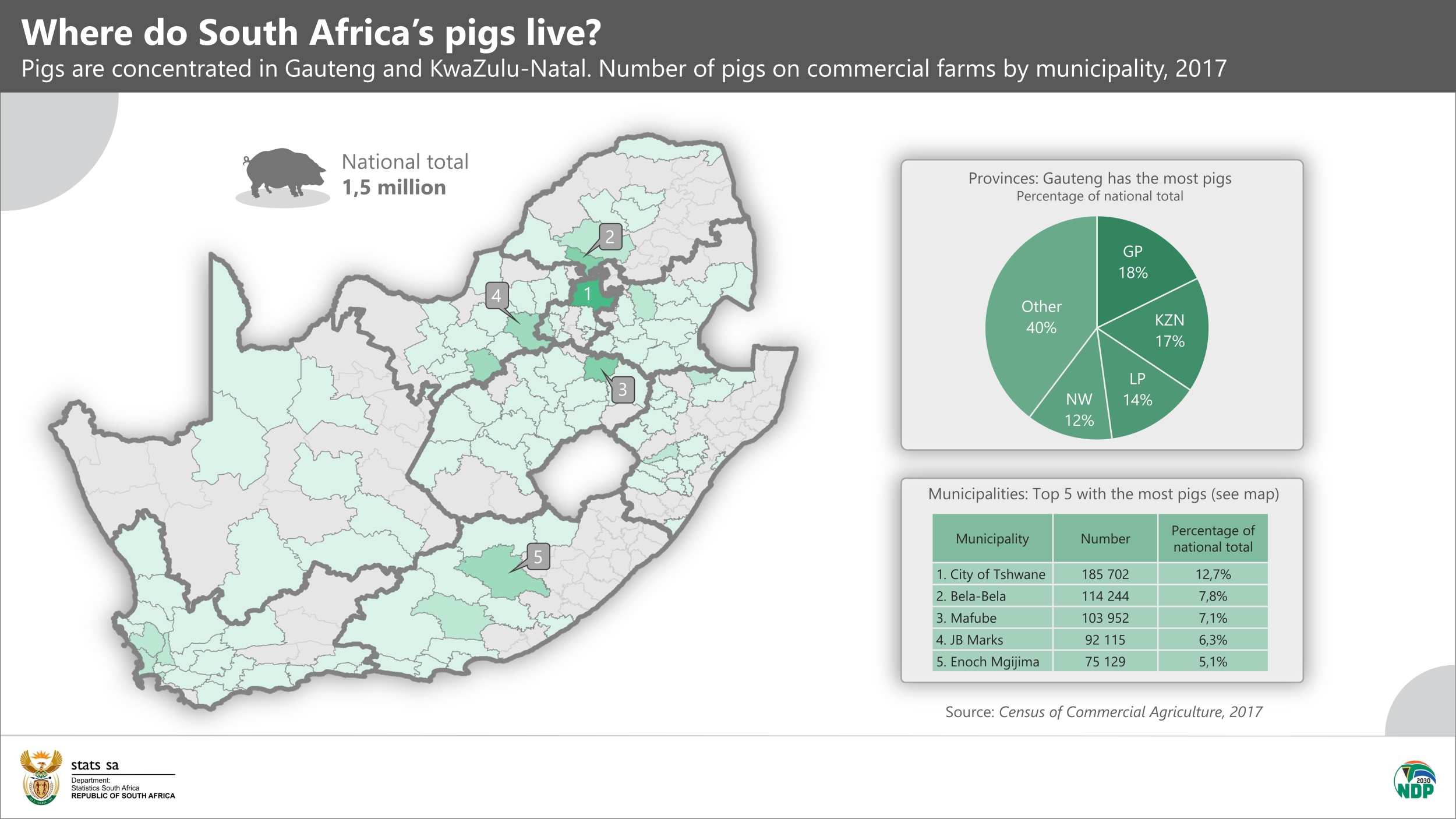 Gauteng, KwaZulu-Natal and Limpopo were home to half of South Africa’s commercially raised pigs in 2017. What’s interesting here is that a significant number – just over 185 000 – were located in the Pretoria region, in Tshwane metropolitan municipality. The concentration of pig farms in this region makes sense as the location provides easy access to the urban and high-income markets of Johannesburg and Pretoria.