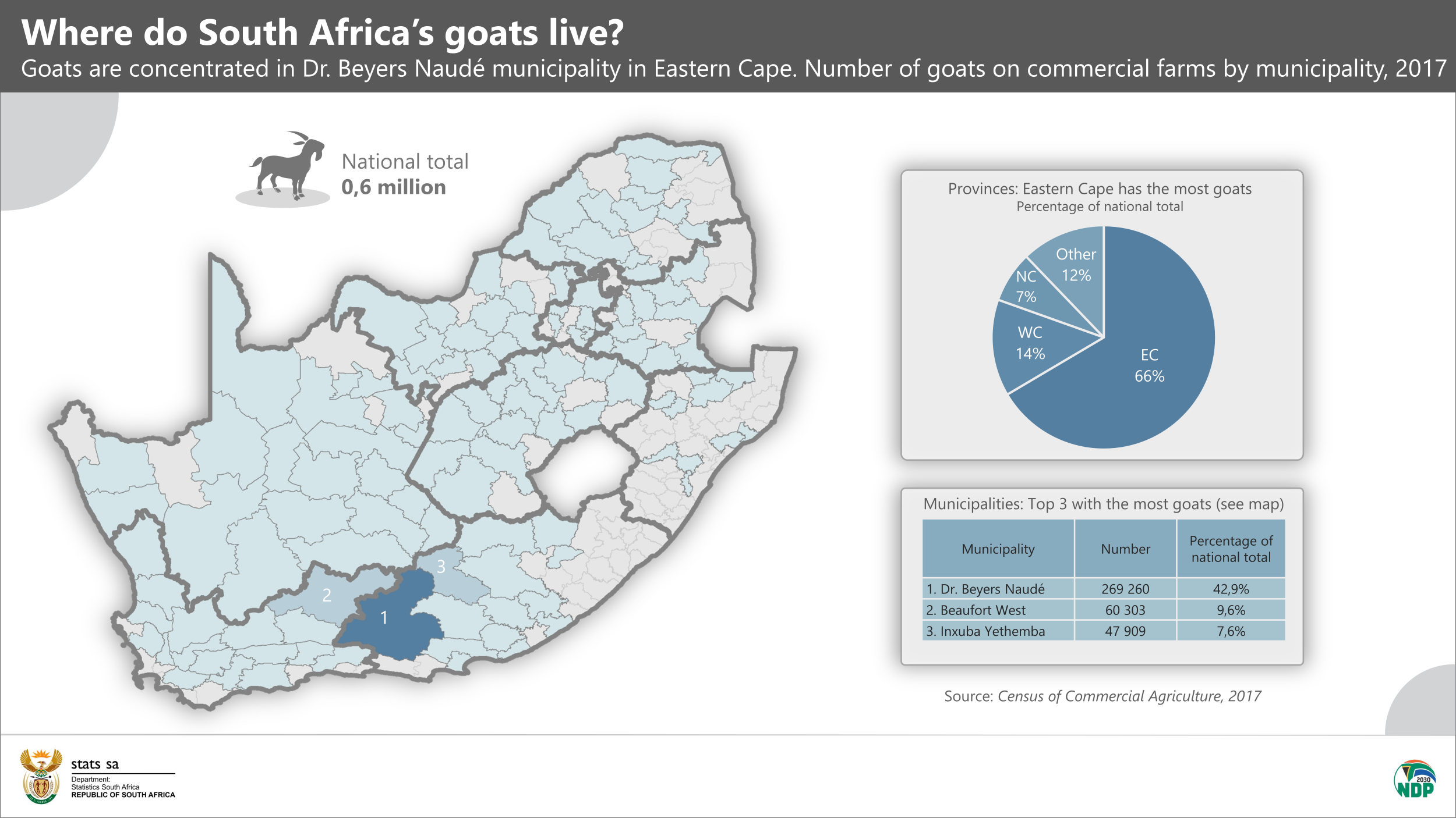 The country’s commercial goat population is the most spatially concentrated, with 60% of goats living in just three municipalities: Dr Beyers Naude and Inxuba Yethemba in Eastern Cape, and Beaufort West in Western Cape.