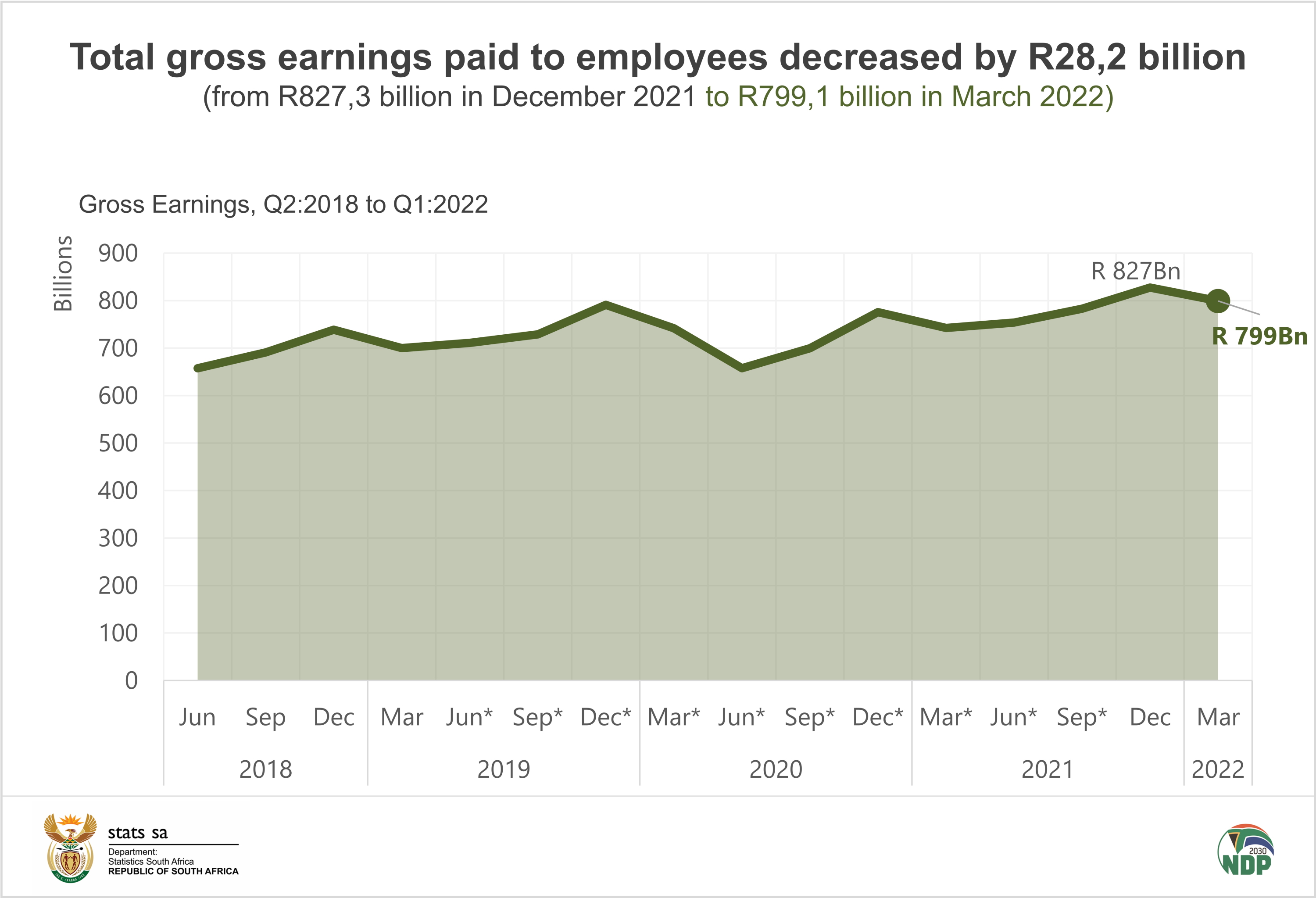 Gross earnings paid to employees decreased by R28,2 billion or -3,4% from R827,3 billion in December 2021 to R799,1 billion in March 2022. This was mainly due to decreases in the community services, manufacturing, transport, trade, construction and electricity industries.