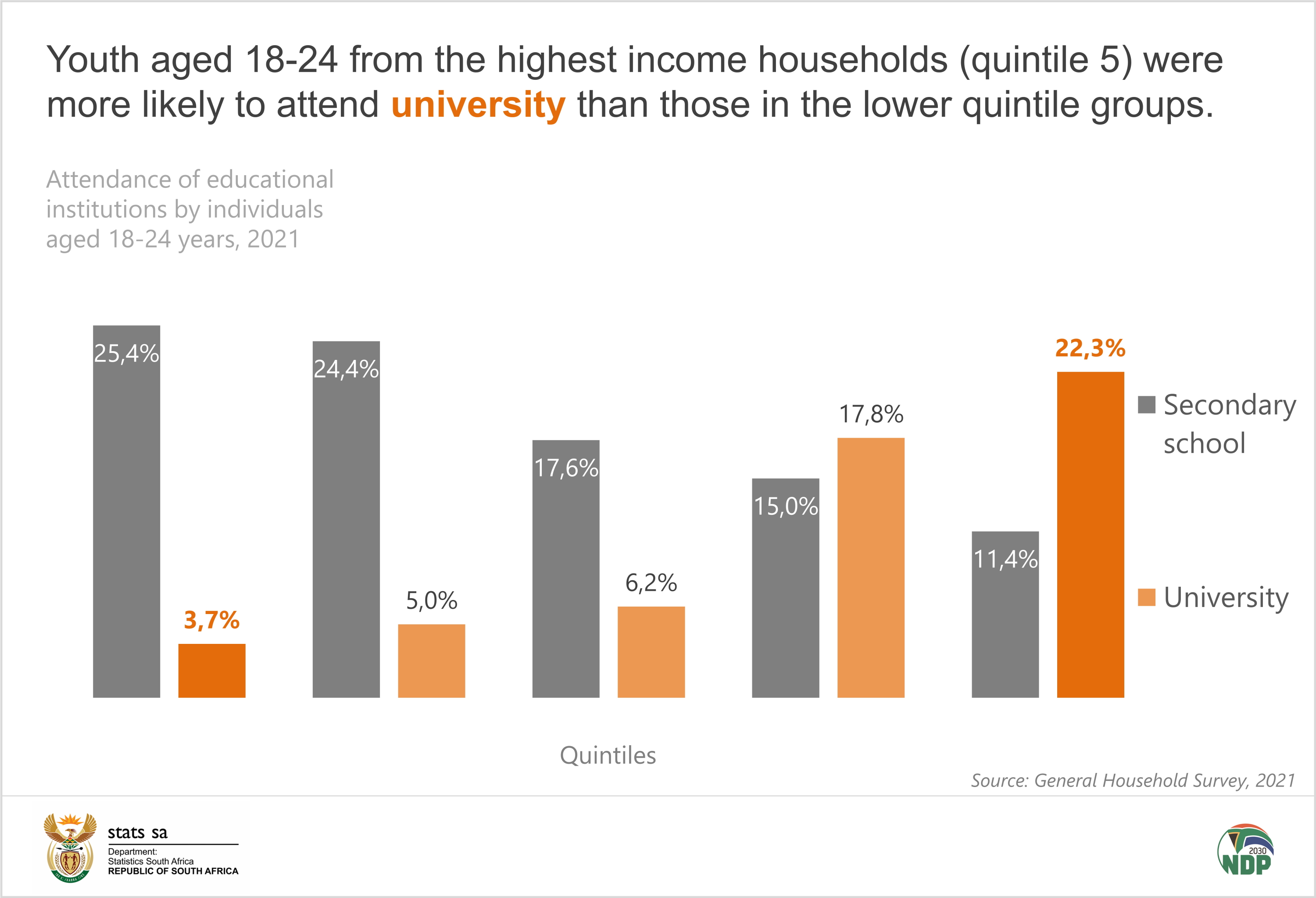 Attendance of educational institutions among youth aged 18–24 in 2021 was relatively high, although a clear lag in completion of grades linked to socio-economic status was noticed. The percentage of individuals aged 18-24 still attending secondary school was higher for those from households in the poorer income groups (quintiles 1 and 2)1 than those from households in the higher income groups (quintiles 4 and 5). Conversely, youth aged 18-24 from the highest income households (quintile 5) were more likely to attend university than those in the lower quintile groups.