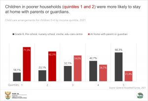 Participation in education among young children is often linked to the socio-economic status of the household. In 2021, attendance of school or ECD facilities was 18,1% in the poorest income group (quintile 1) and almost tripled to 60,3% for the highest income group (quintile 5). Inversely, children in poorer households (quintiles 1 and 2) were more likely to stay at home with parents or guardians.