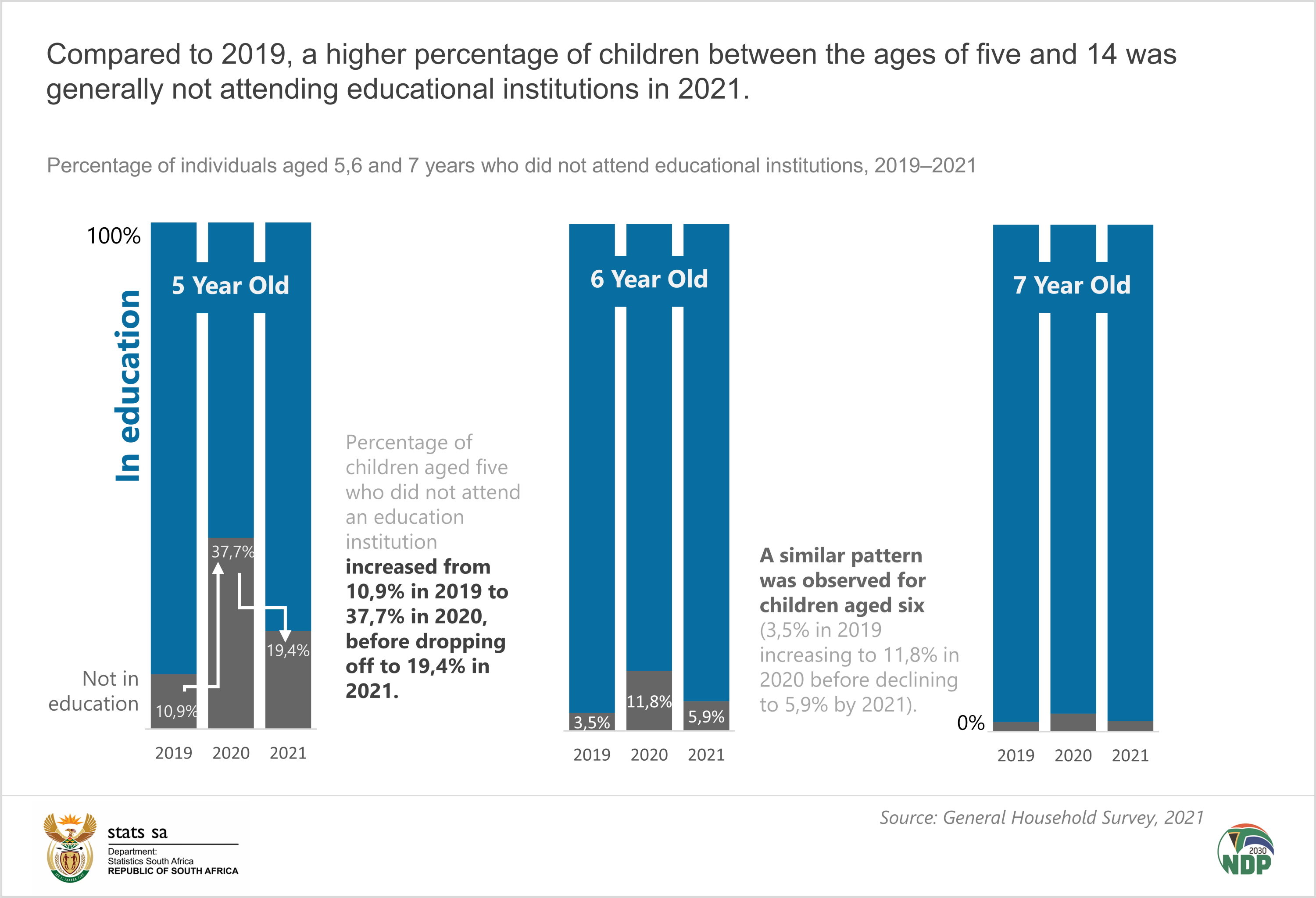 In 2020, a rapid increase in the number of out-of-school children and youth in South Africa was noted. This was mainly due to school closures during the COVID-19 lockdown in 2020. Distance learning was not an effective measure in South Africa as access to digital learning was limited. In 2021, when schools could still not be fully open, most schools settled for in-school learning with some form of hybrid model entailing instructions of rotational attendance combined with distance education. However, the percentage of out-of-school children aged 5–18 remained high in 2021 compared to 2019, while a relative reduction was observed compared to 2020.