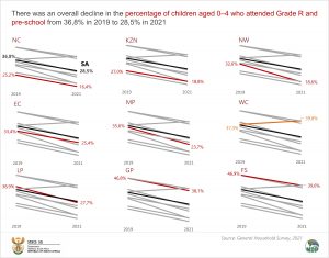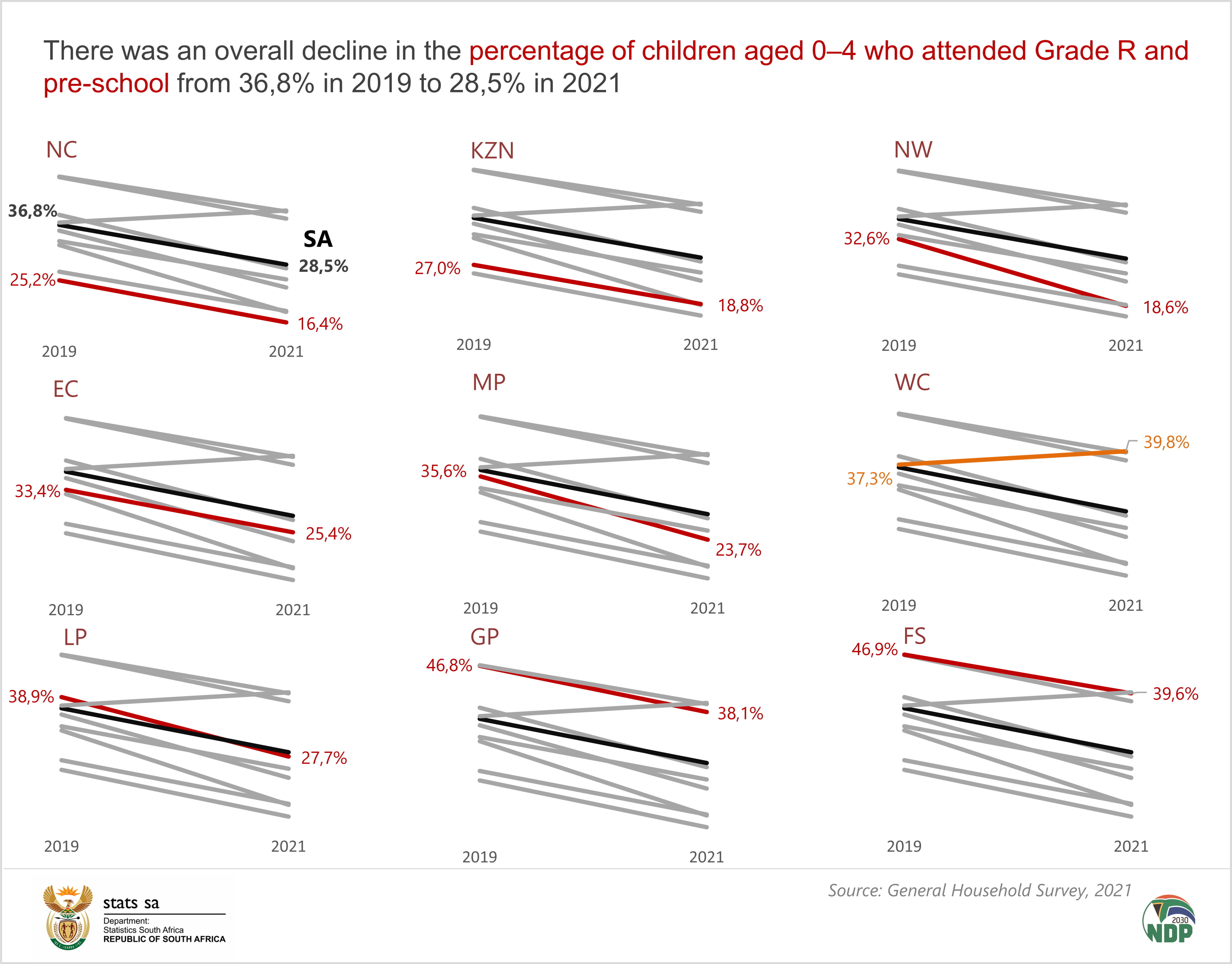 There was an overall decline in the percentage of children aged 0–4 who attended Grade R and pre-school, from 36,8% in 2019 to 28,5% in 2021. This was prevalent in disadvantaged areas. The highest decline was observed in North West with a reduction in attendance of 14 percentage points followed by Mpumalanga and Limpopo at 11,9% and 11,2% respectively. However, the attendance of ECD remained unaffected in the Western Cape compared to previous years. In 2021, the attendance of ECD among young children was the lowest and was below the national average in Northern Cape (16,4%) followed by North West (18,6%) and KwaZulu-Natal (18,8%).