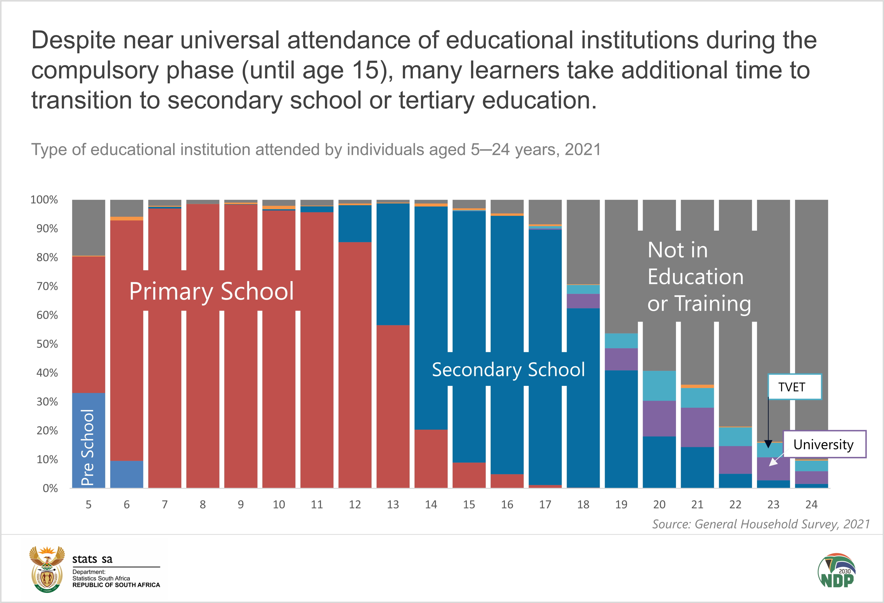 In 2021, close to 3% of 15-year-olds and nearly 9% of 17-year-olds dropped out of school. The General Household Survey, 2021, released by Statistics South Africa, indicates that although most 18- and 19-year-olds were still attending secondary school, almost three out of 10 pupils aged 18 years (29,3%) and 4 out of 9 (46,3%) of 19-year-olds had dropped out of school. The majority of 20-year-olds were not in education, with approximately 23% attending university, TVET or other colleges, while 18% were still attending high school.
