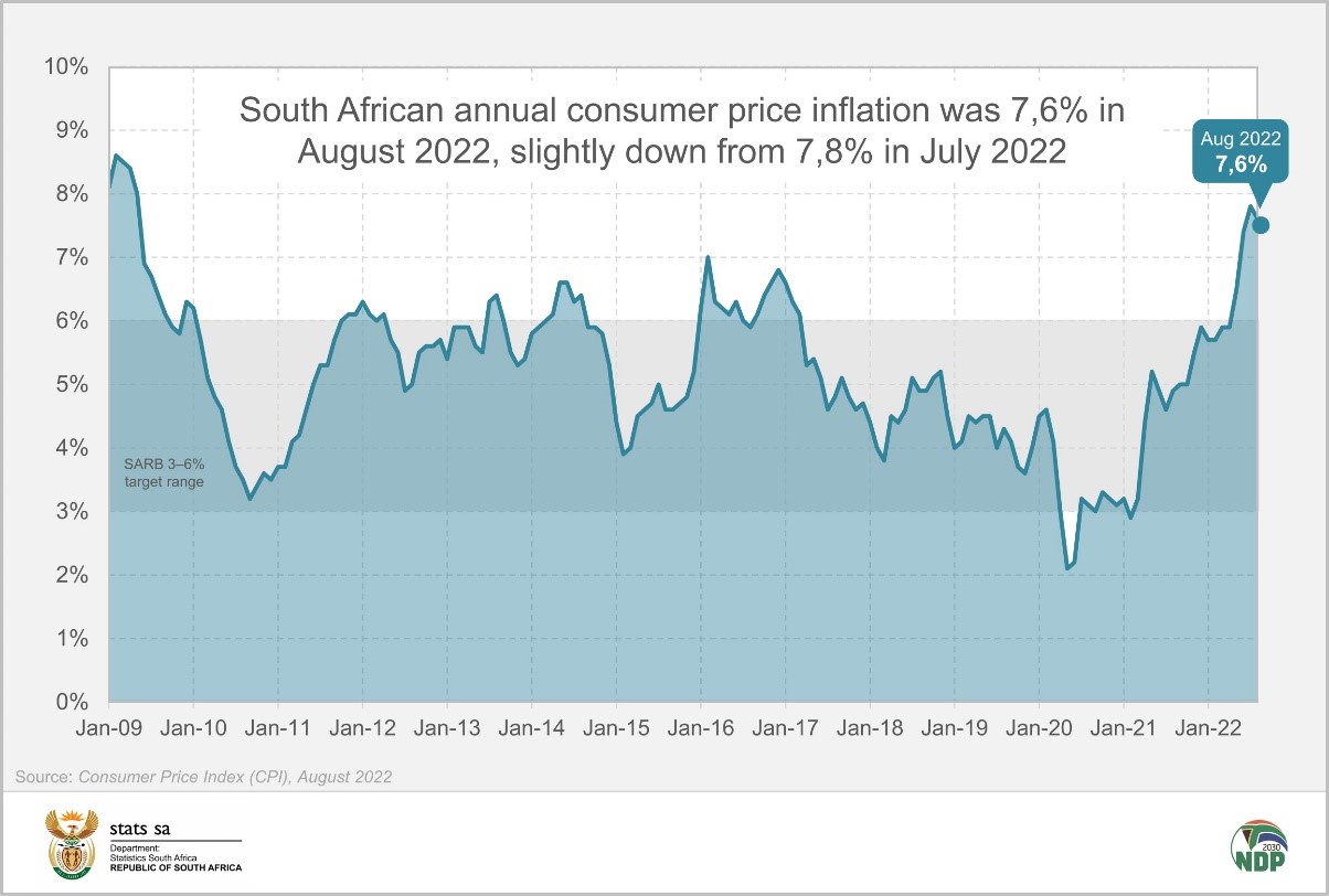 Annual consumer inflation dipped to 7,6% in August from 7,8% in July. The monthly increase in the consumer price index (CPI) was 0,2%, the lowest reading since January 2022 when it was also 0,2%.