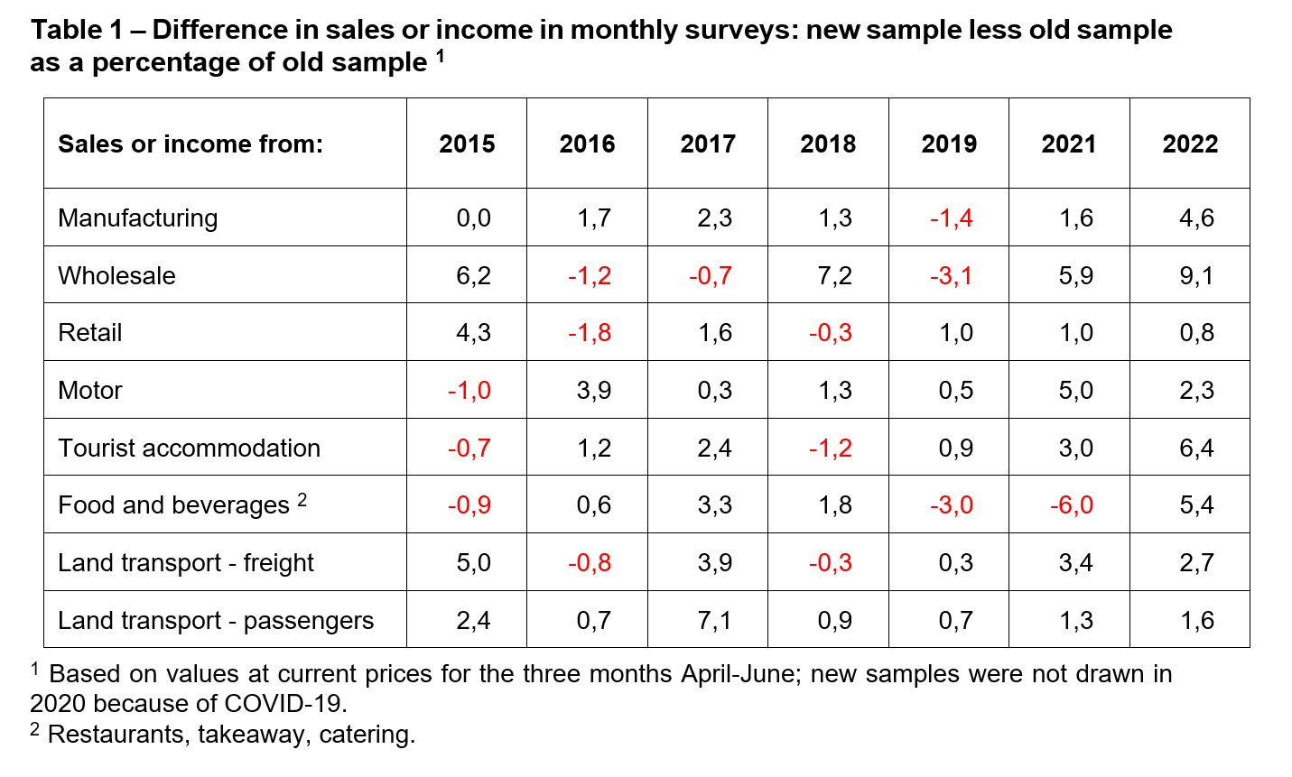 For each of the surveys listed above, the new samples were run in parallel with the old samples for three months, namely April, May and June 2022. This is the same methodology that has been in use for many years. Comparisons between new and old samples are provided in Table 1. For example, in 2022 the level of manufacturing sales was 4,6% higher based on the new sample. The differences ranged from 0,8% (retail) to 9,1% (wholesale). Table 1 shows the history of level changes between old and new samples going back to 2015.