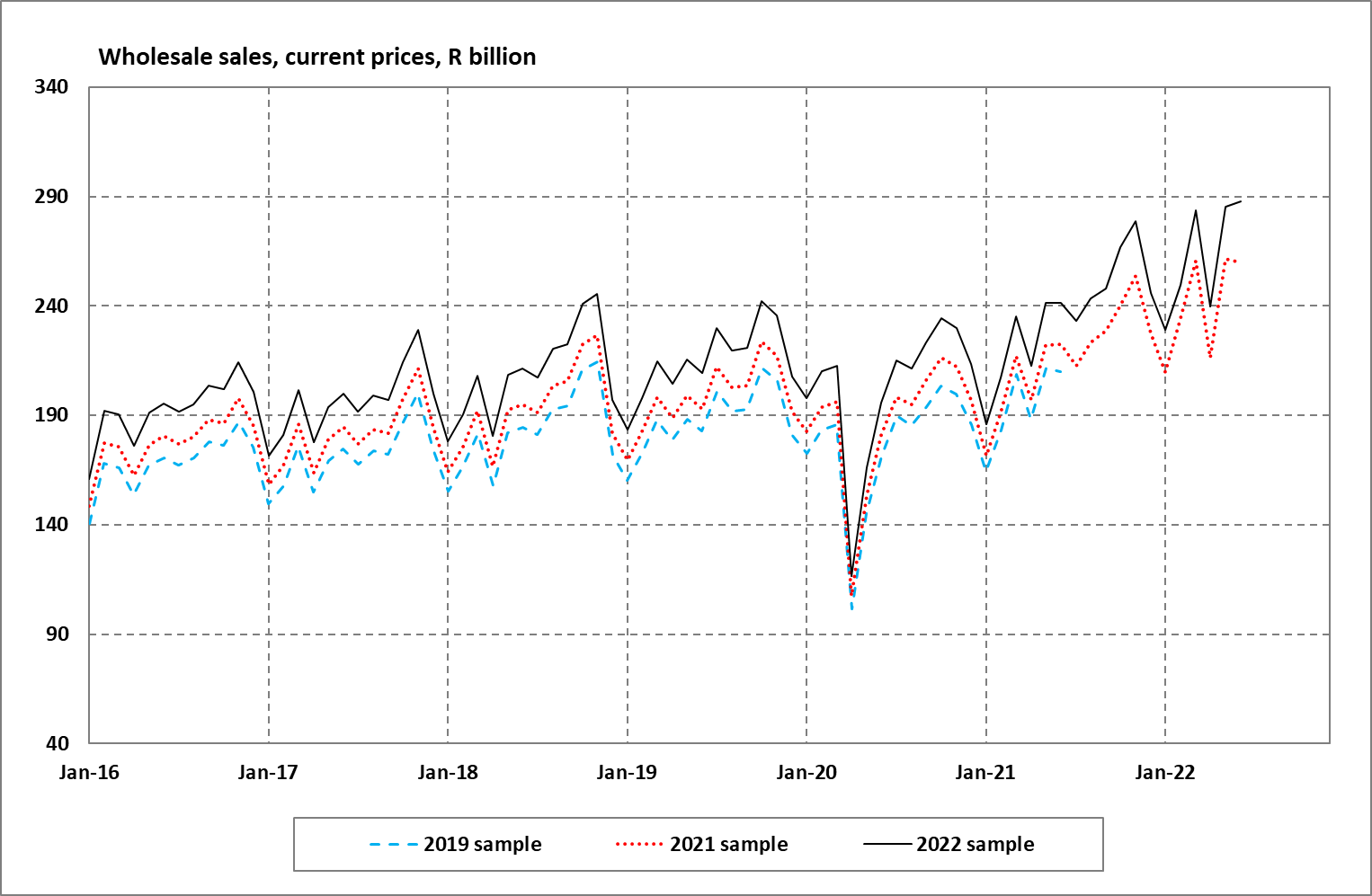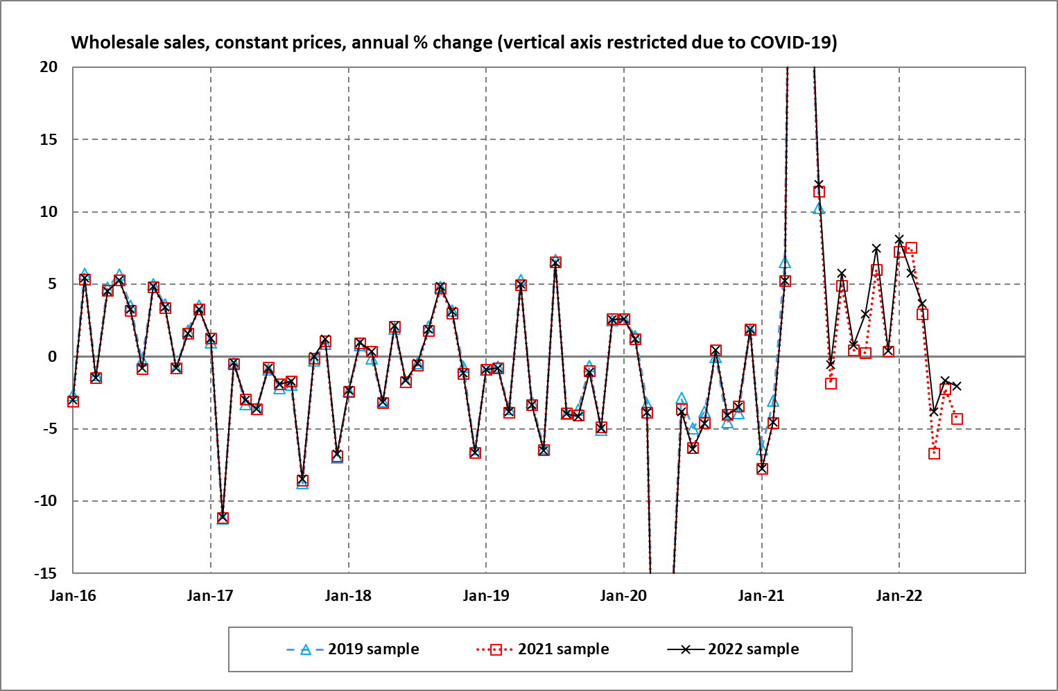 Figure 1 illustrates the effect of new samples in terms of levels, measured at current prices. Wholesale trade sales are shown for three different samples, namely 2019, 2021, and 2022. Normally the 2019 sample would have run until June 2020, but COVID‑19 prevented the implementation of new samples in 2020, so the 2019 sample was extended to June 2021. A new sample was drawn in 2021, which was used up until June 2022. The 2022 sample will be used until June 2023.
