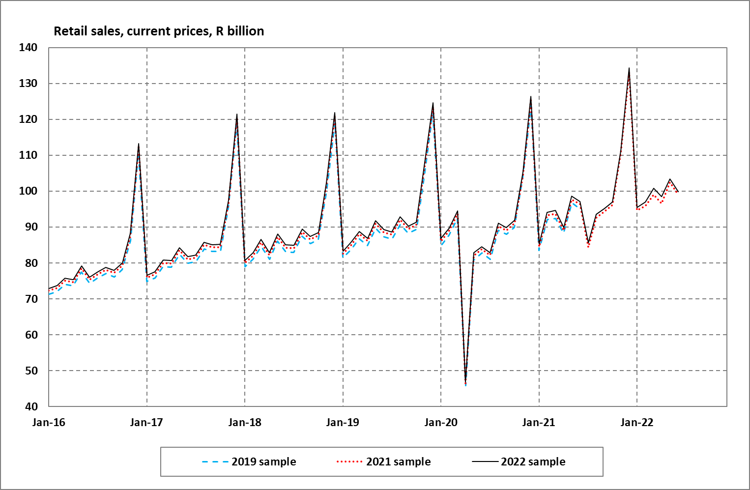 New samples are implemented annually to keep monthly surveys up to date with changes in Stats SA’s business register, which is based on information provided by the South African Revenue Service. New samples typically result in changes in levels of sales and income, which would distort growth rates if the estimates based on different samples were not linked. Consequently, Stats SA runs parallel surveys to measure differences in levels caused by new samples, and uses this information to revise historical series such that the old series can be linked to the new series with no artificial breaks. This is important for growth rates for two reasons. First, growth rates are not distorted by changes in the sample, and second, newly calculated growth rates are close to growth rates previously published.