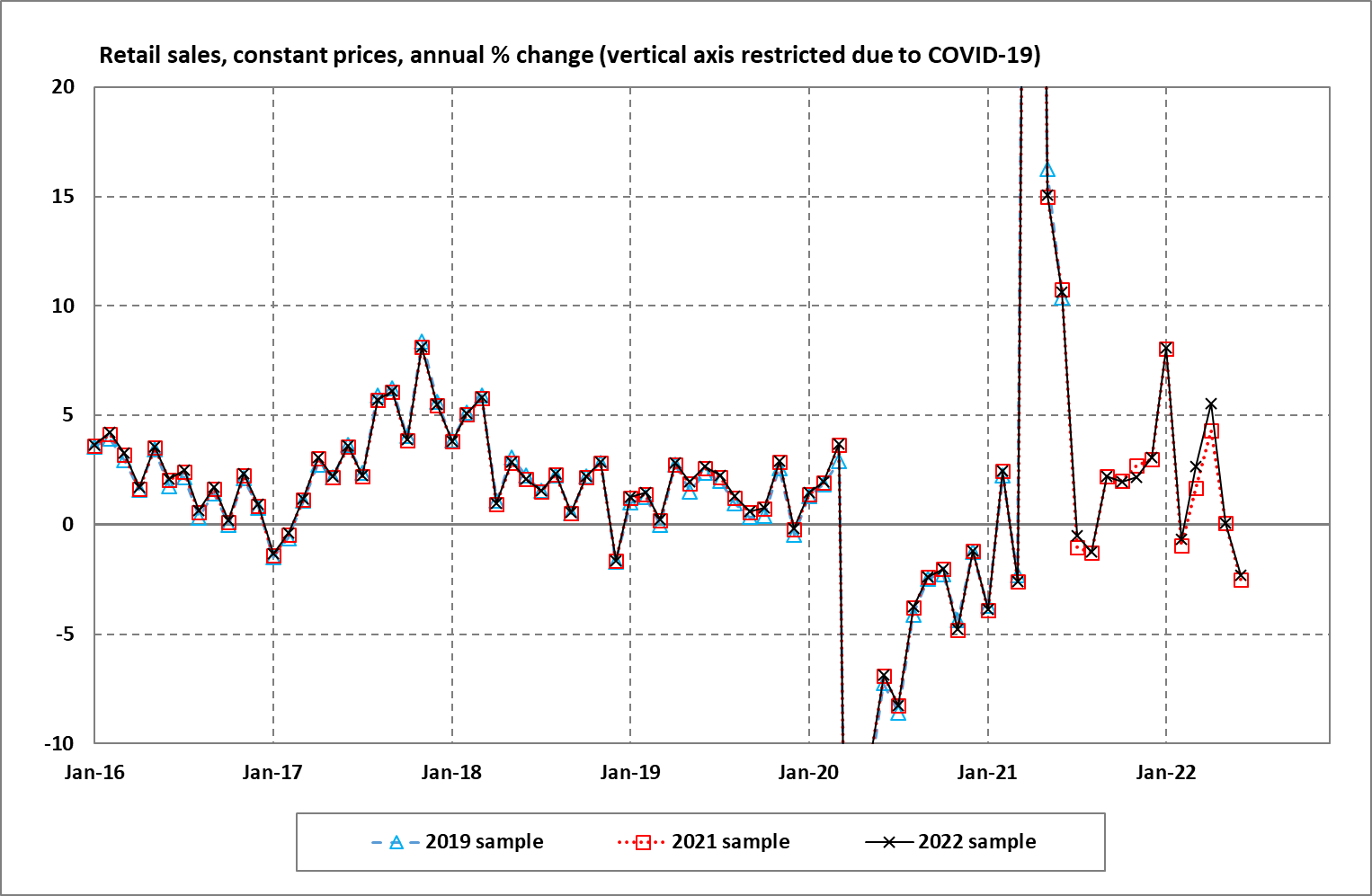 Figures 3 and 4 show the results for retail trade sales, and they work in the same way as Figures 1 and 2. The gaps between the samples in Figure 3 (retail) are much smaller than those in Figure 1 (wholesale), reflecting the differences between retail and wholesale that we see in Table 1 (for 2021 and 2022).