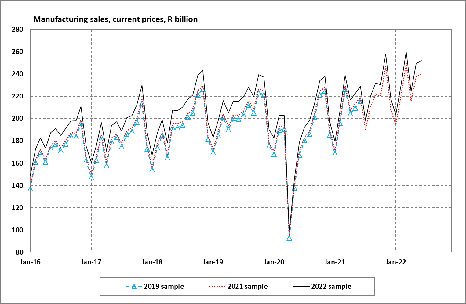 Figure 5 shows manufacturing sales based on the three different samples for 2019, 2021, and 2022. The 2022 sample lies above the 2021 sample, which lies above the 2019 sample.