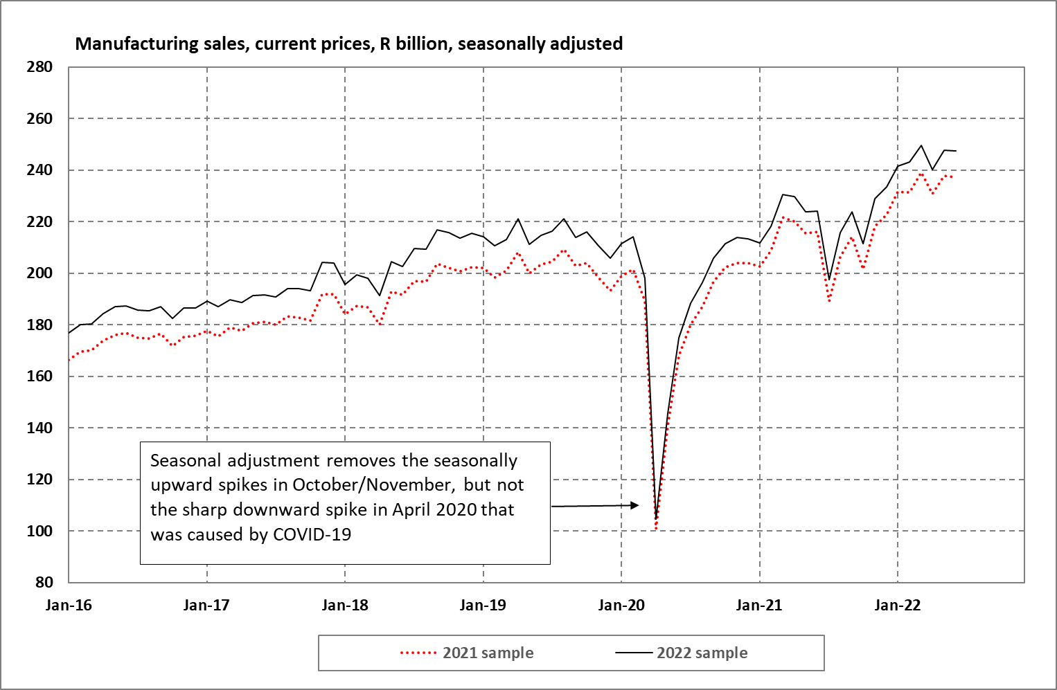 The sharp upward spikes around October / November that we see each year are the seasonally high manufacturing sales ahead of the festive season. Figure 5 also shows the large economic impact of COVID‑19 in April 2020.