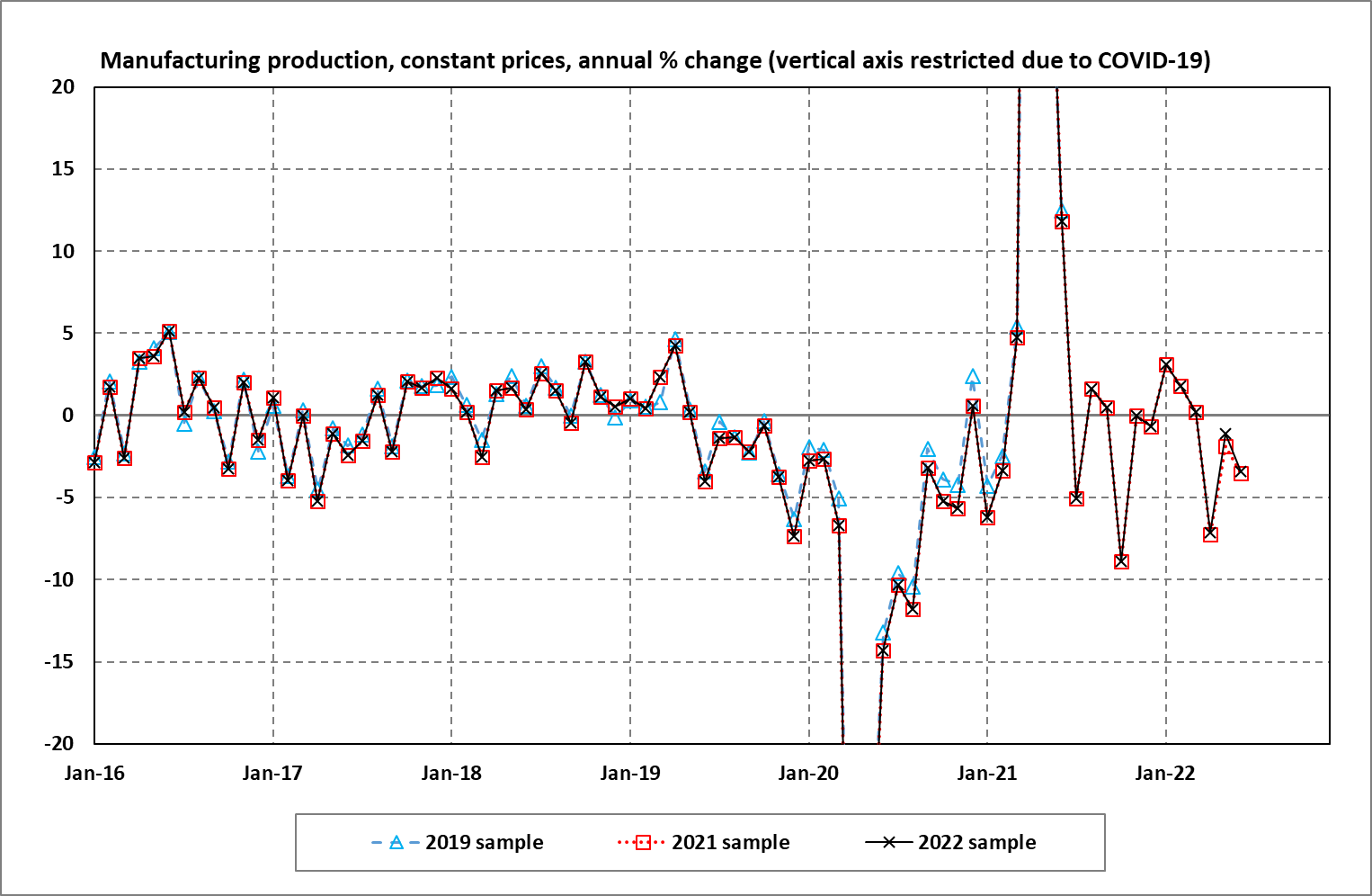 Figure 7 shows annual growth rates for manufacturing production, calculated from the manufacturing production index. Note that no linking is required for the production index when new samples are introduced, because although manufacturing sales are an important input for calculating production, the level of the production index is anchored at its base-year average of 100 in 2019.