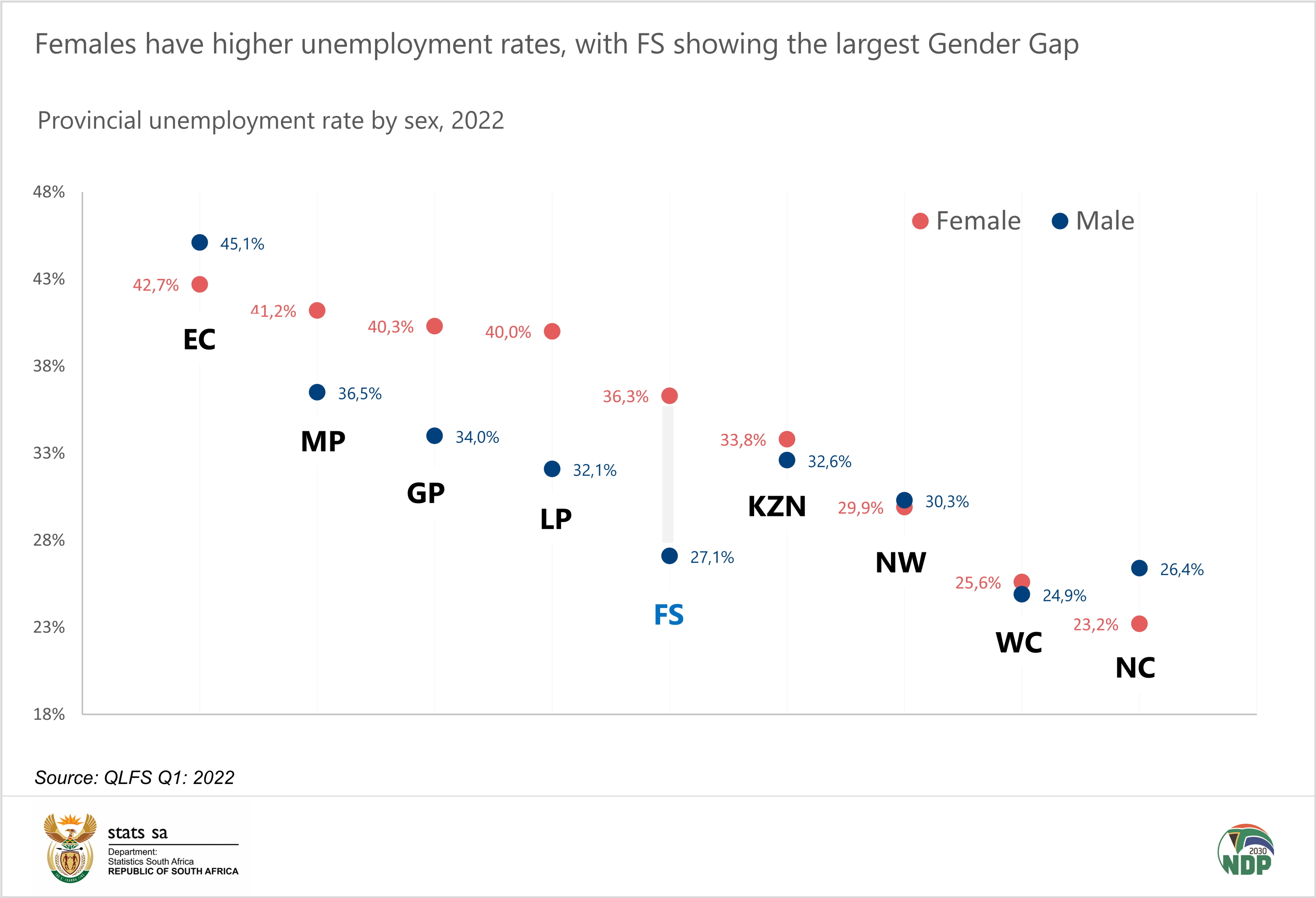 More than half (51,1%) of the South African population are female[1] and, according to the General Household Survey (GHS) 2021, more than two-fifths (42,0%) of households are headed by females. While women empowerment is central to the global development agenda and is a stepping stone to gender equality, a new report released by Statistics South Africa titled Gender Series Volume IX: Women Empowerment, 2017–2022 shows that women in SA are more likely to be unemployed than men and are less likely to participate in the labour market than their male counterparts.
