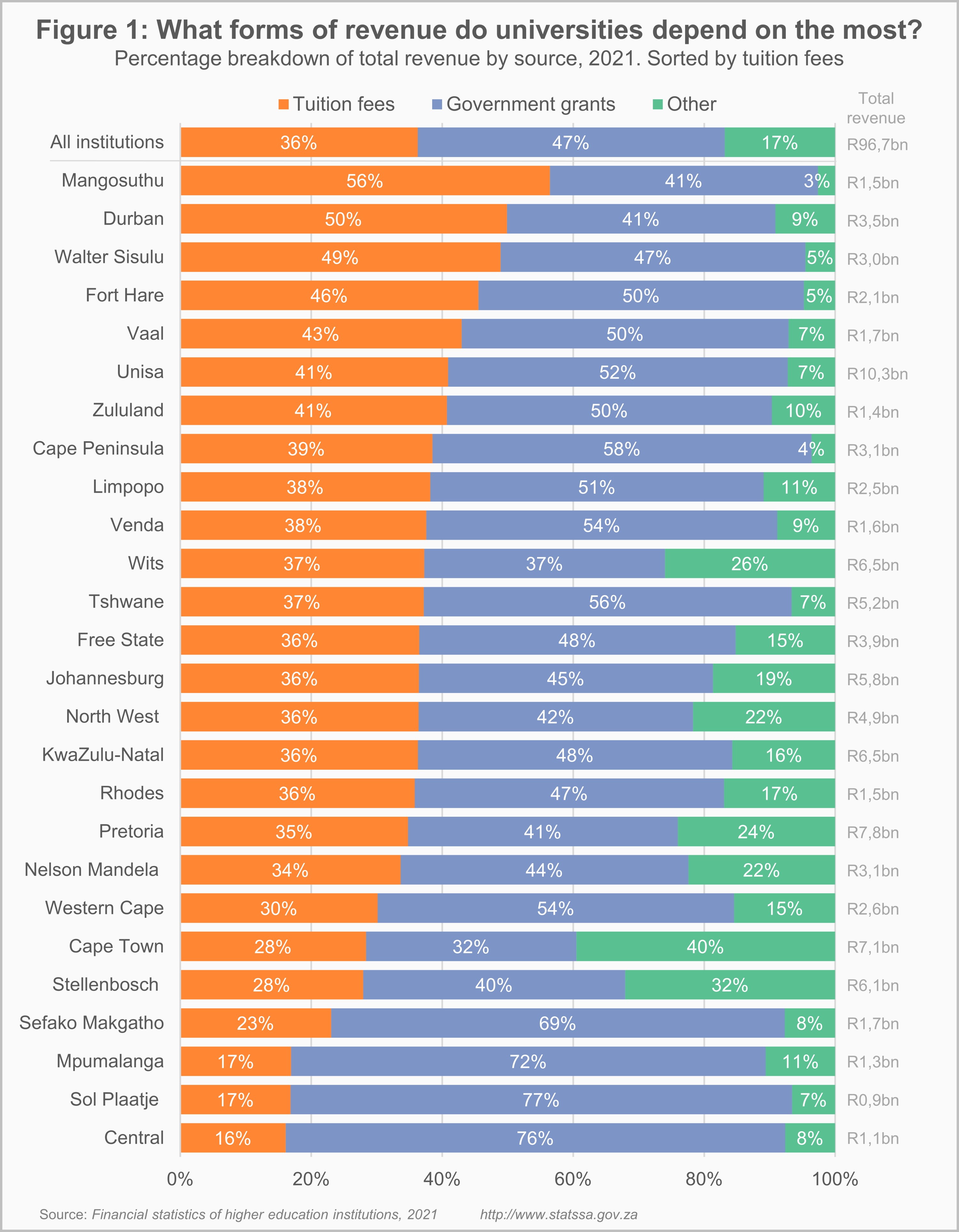 South Africa’s 26 higher education institutions depend on three main sources of revenue, according to the Financial statistics of higher education institutions statistical release.1 In 2021 the second biggest source of money after government grants was tuition fees, accounting for 36% of total revenue (Figure 1). Government grants contributed 47%, while the remainder was from other sources, such as donations and research income. Not to be confused with social grants, government grants are financial transfers between government institutions.