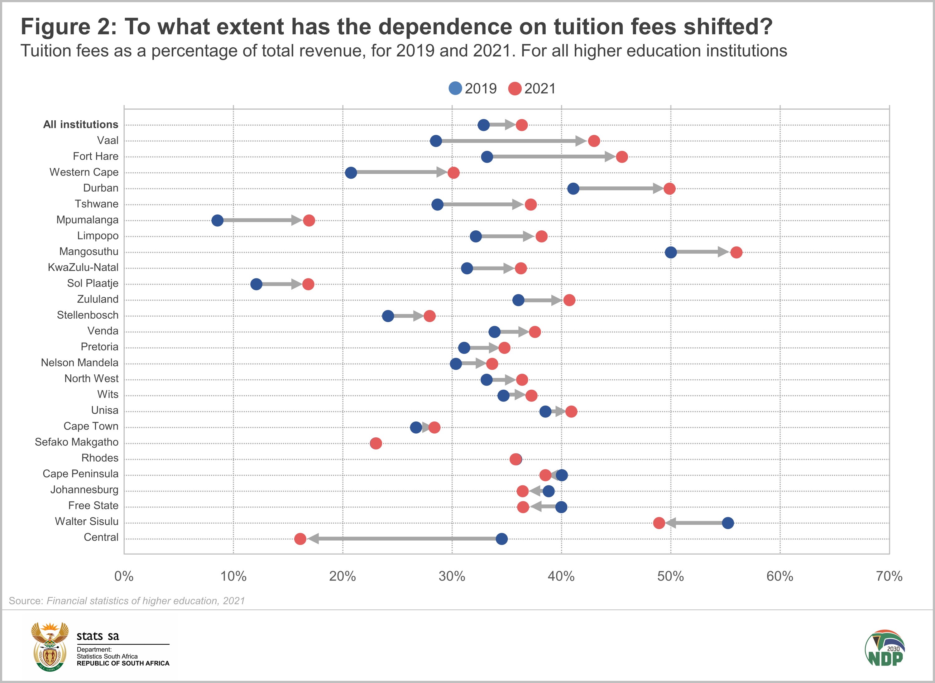 Breaking this down by institution, and comparing 2021 with 2019, the share of tuition fees in total revenue increased for nineteen institutions, remained stable for two, and decreased for five (Figure 2).