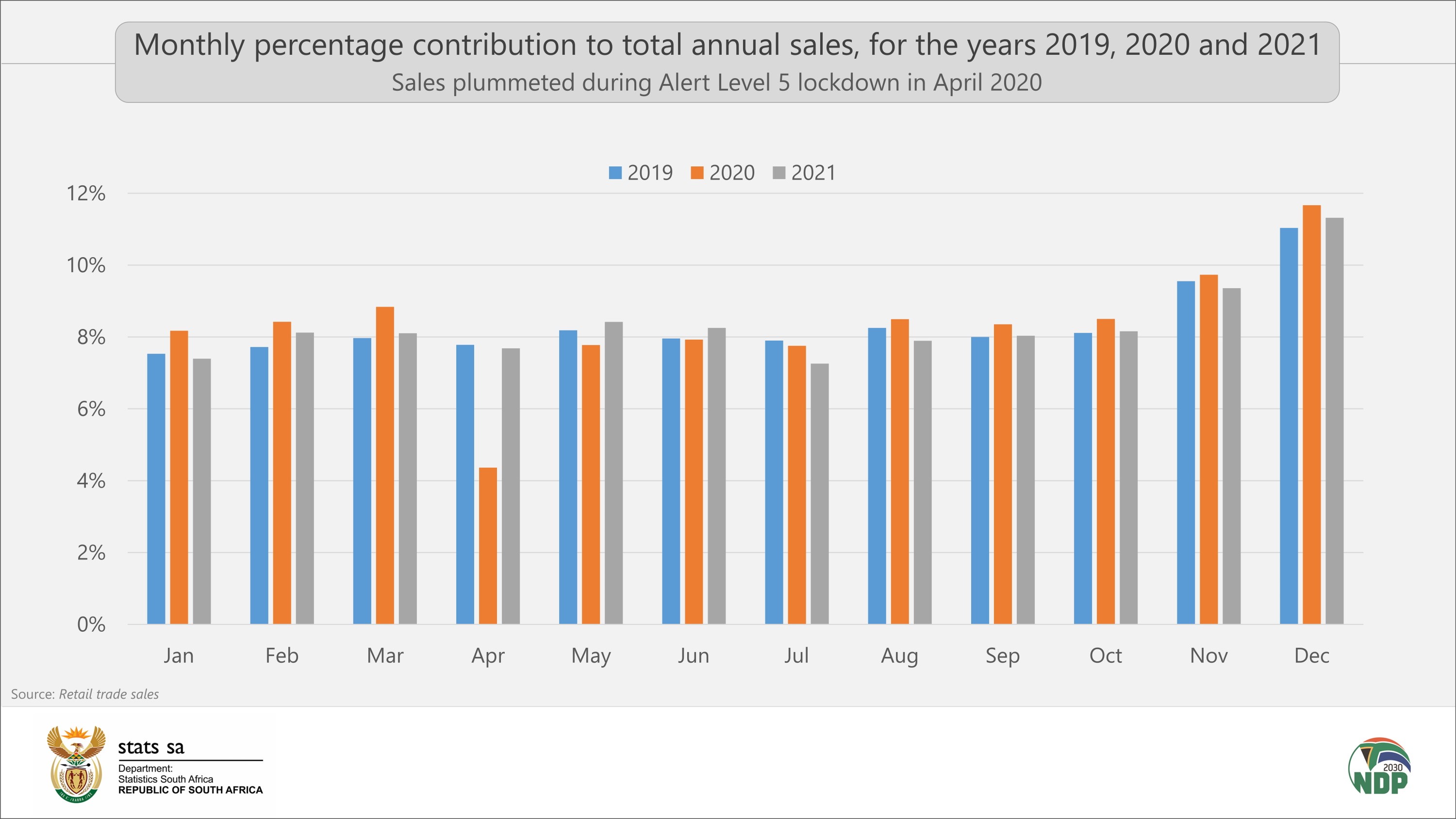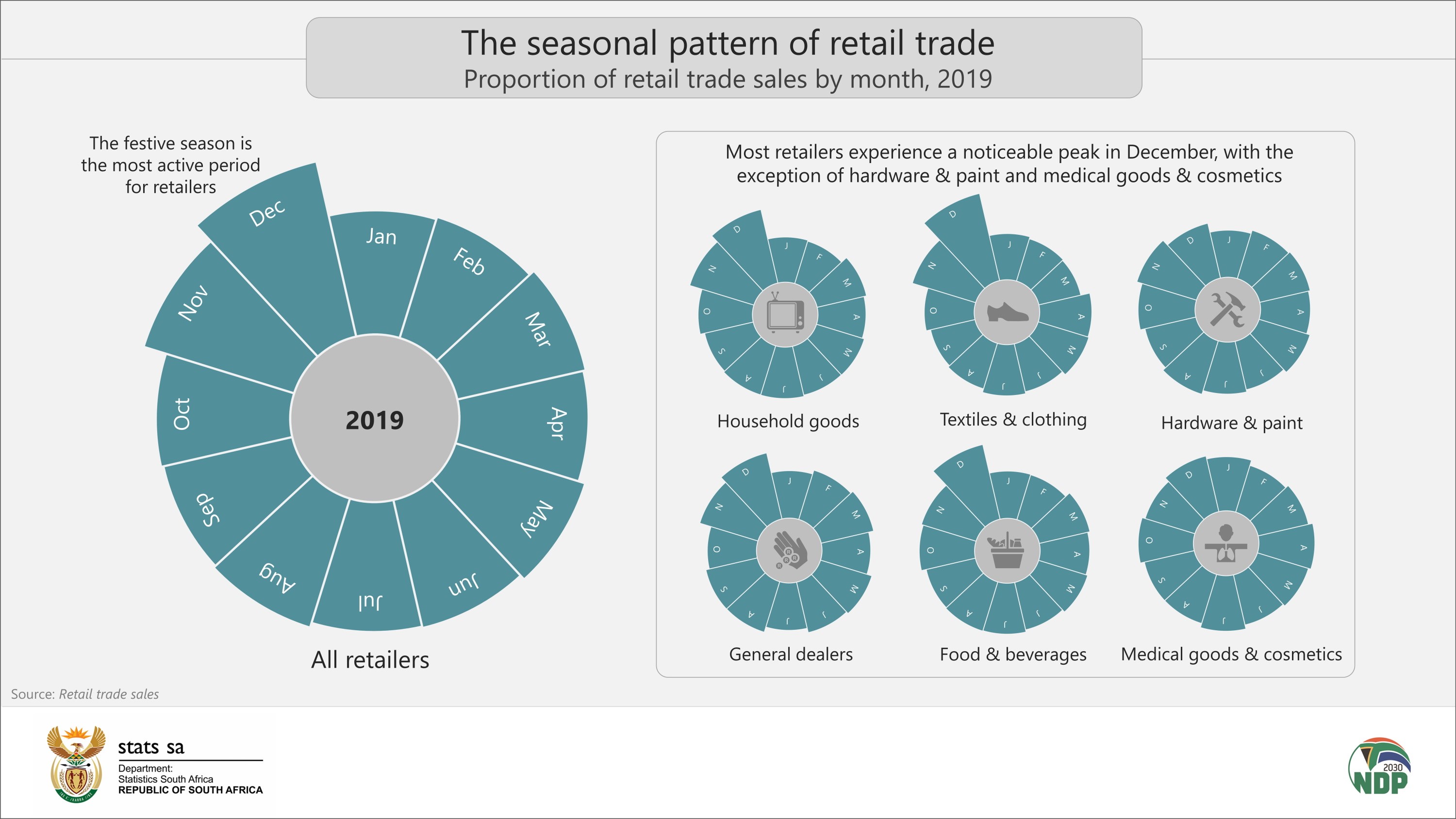 The graphic below shows the distribution of retail trade sales by month, for the year 2019. If all months contributed equally to annual sales, the average would be 8,3% each month. A clear seasonal pattern stands out, with December the most active month for many retailers. If we consider the entire sector, December accounted for 11% of total annual sales in 2019 (click on the image to enlarge).1