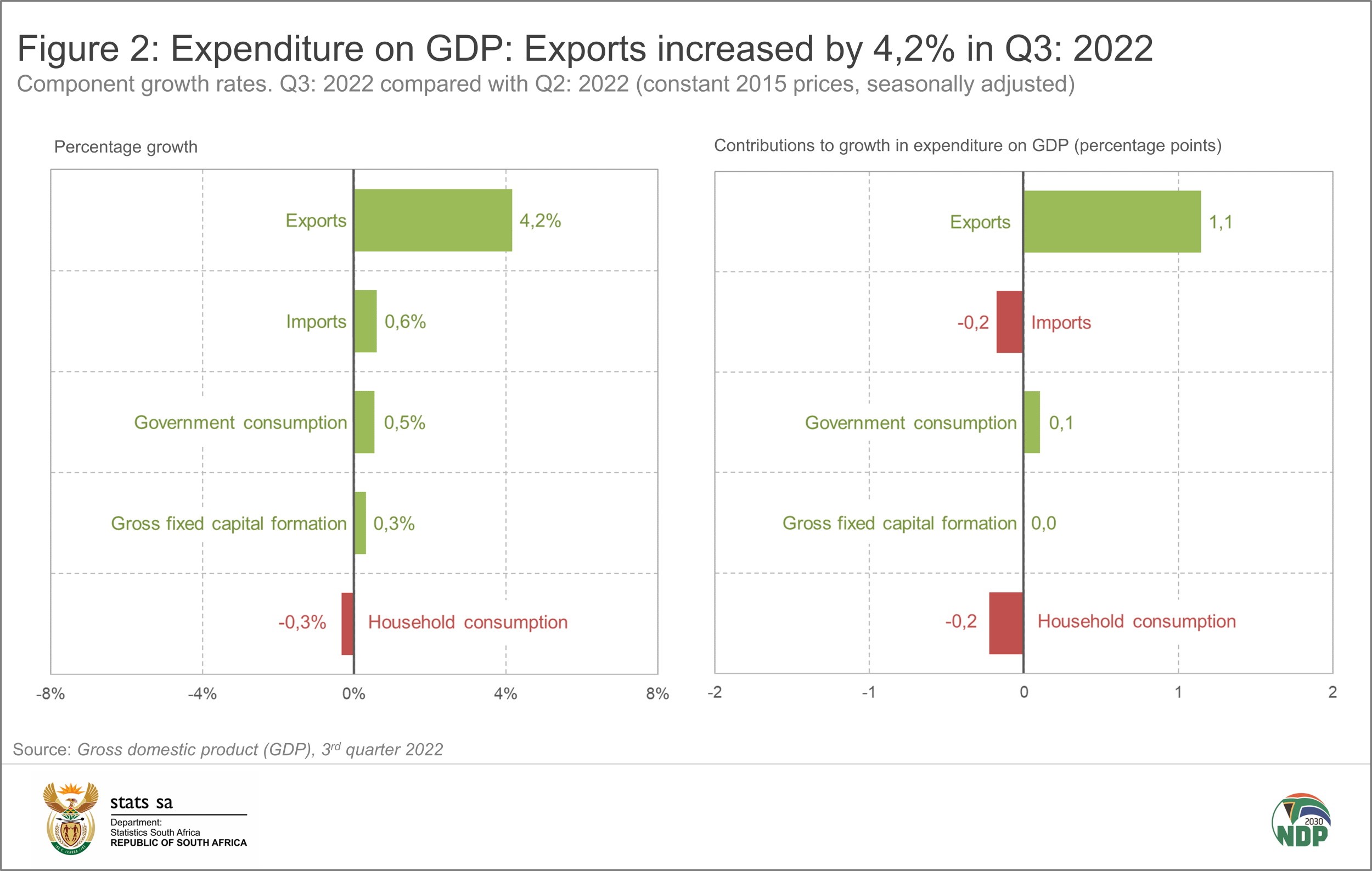 Exports increased by 4,2% in the third quarter (Figure 2), driven mainly by increased trade in mineral products, metals, vegetable products and paper products. The rise in government consumption was led by increased spending on goods and services.