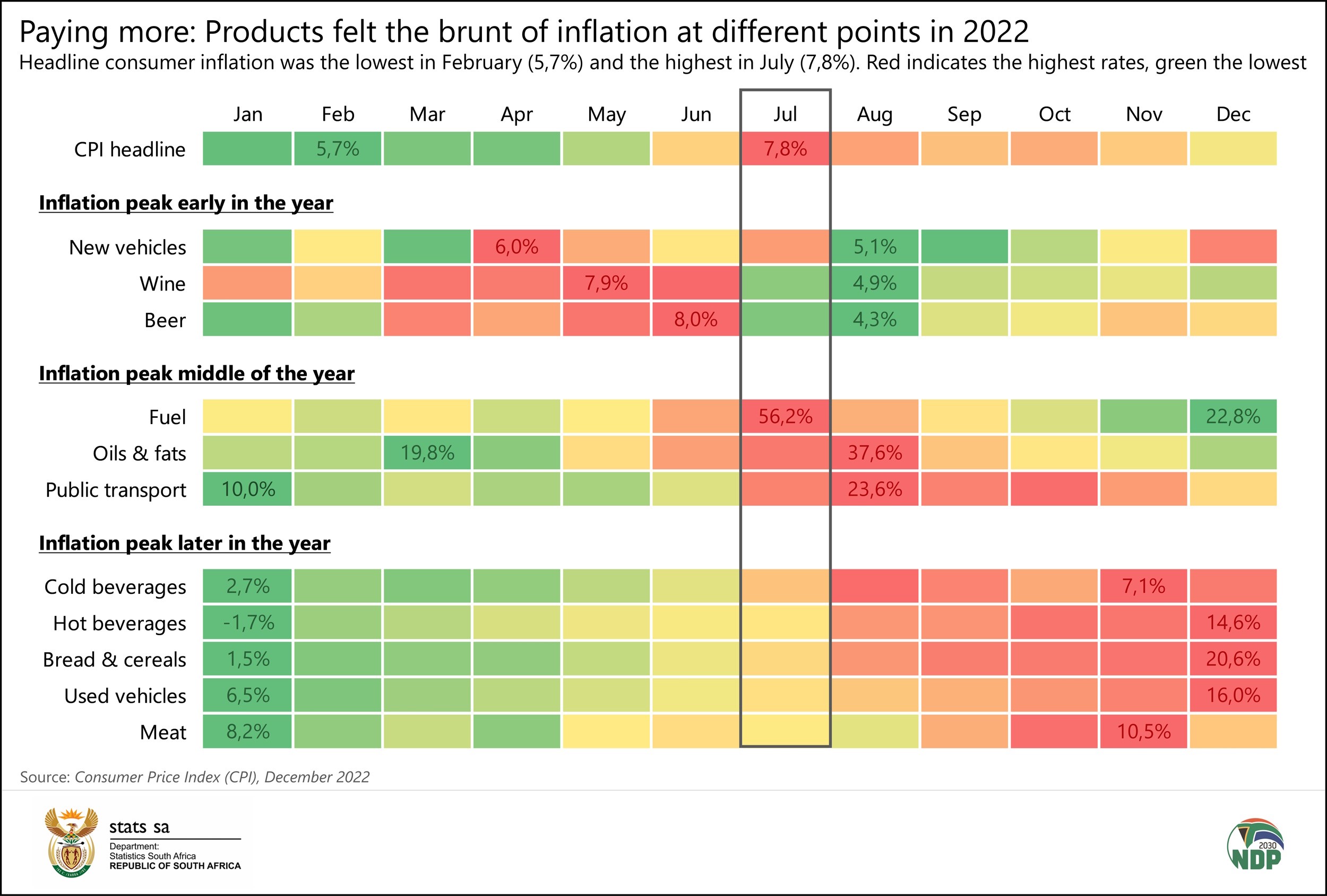 After peaking in July, headline inflation eased to 7,2% in December. The most influential product groups during the year – transport (especially fuel) and food & NAB products – continue to register high rates of inflation compared with other items in the basket.