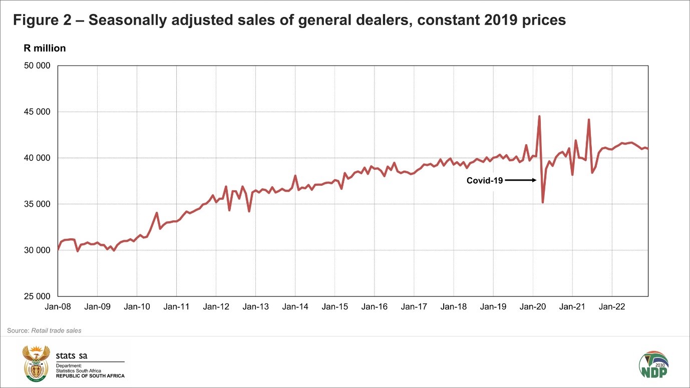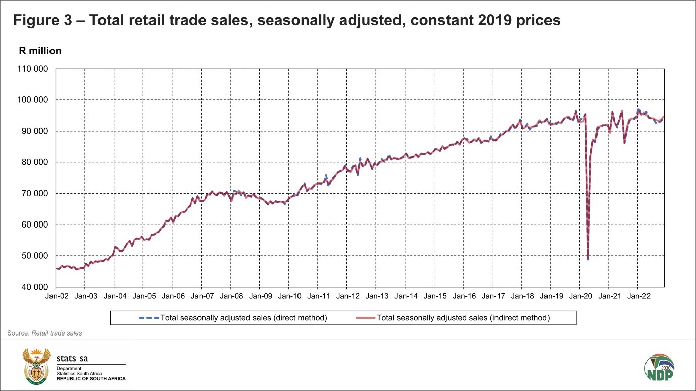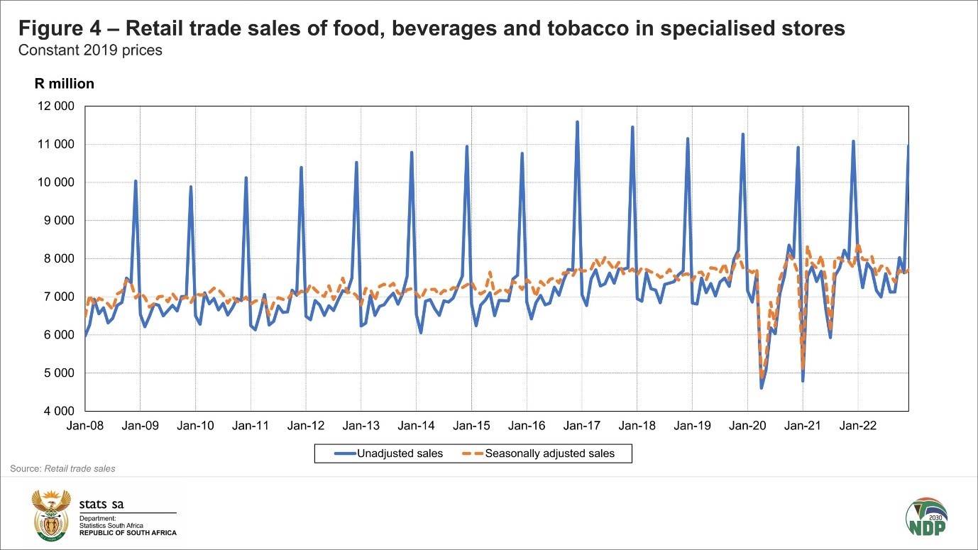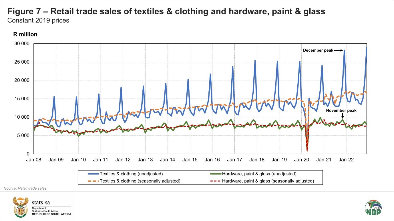 Stats SA has published seasonally adjusted estimates for total retail trade for many years. We have now expanded this to include its components, namely general dealers (supermarkets) and other more specialised retailers in food & beverages, medical, clothing, furniture, appliances, hardware, etc.