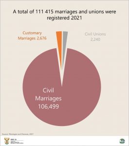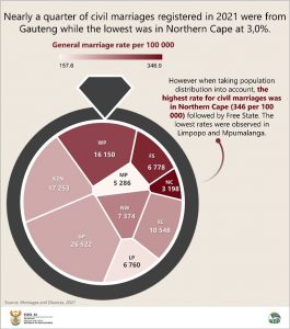 Information contained in Statistics South Africa’s latest release, Marriages and Divorces, 2021, states that in South Africa, 106 499 marriages took place in 2021 compared to 161 112 in 2012. Nearly a quarter (24,9%) of the civil marriages registered in 2021 were from Gauteng and the lowest was in Northern Cape with 3,0%.