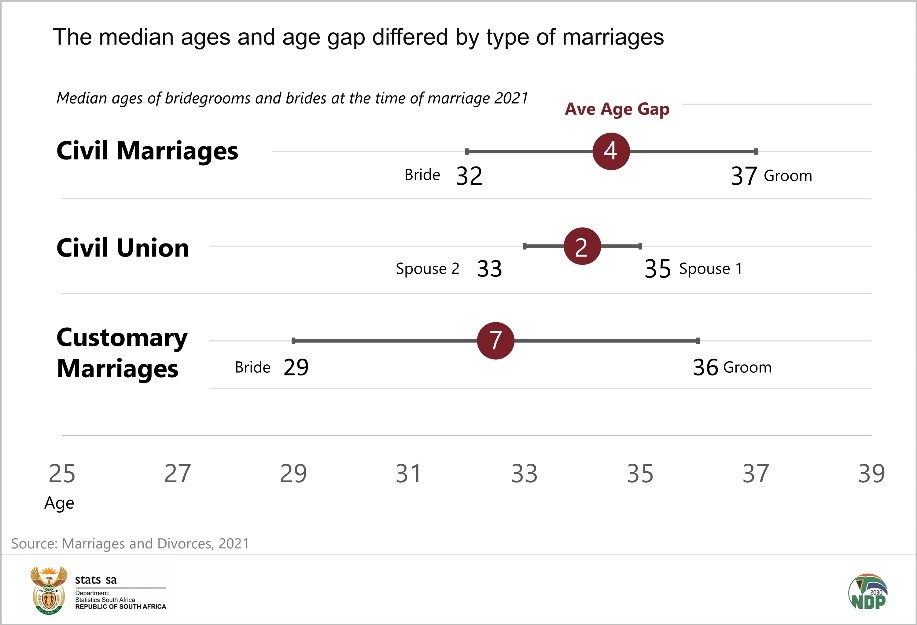 In terms of Customary marriages, 2 676 customary marriages were registered at the Department of Home Affairs in 2021, compared to 1 585 in 2020. You are more likely to be married in Limpopo at 18 marriages for every 100 000 population, followed by Mpumalanga with 11, then Kwa-Zulu Natal at 9 marriages for every 100 000 population. The median age of bridegrooms in customary marriages was 36 years in 2021, while that of brides was 29 years in the same period.