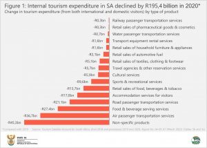 Internal tourism expenditure (inbound and domestic expenditure grouped together), decreased from R455,8 billion in 2019 to R260,4 billion in 2020. The tourism sector therefore lost R195,4 billion in tourism spend in 2020. Internal tourism expenditure was down across all tourism product groups, with tourism non-specific products3 the largest contributor to the decline. This was followed by air passenger transportation services and food & beverages servicing services (Figure 1).