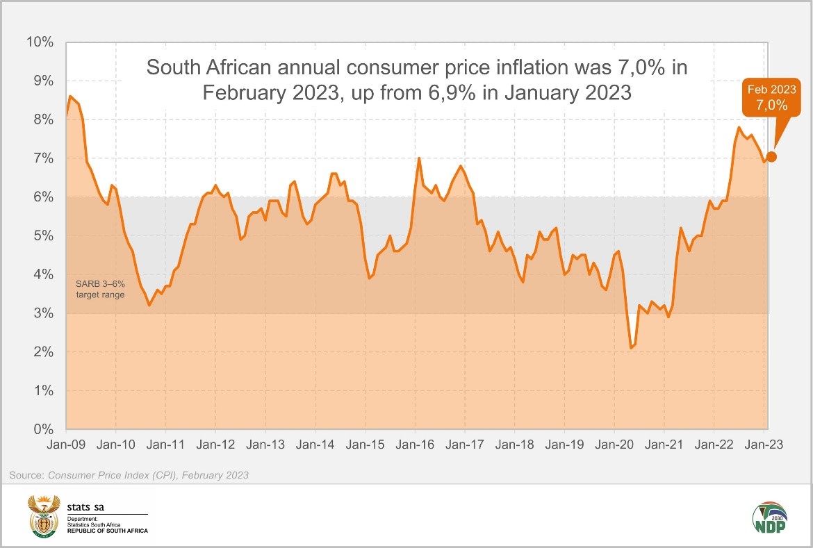Annual consumer inflation rose for the first time in four months, edging to 7,0% in February from 6,9% in January. Food and non-alcoholic beverages and transport were the main contributors to the inflation rate in February.
