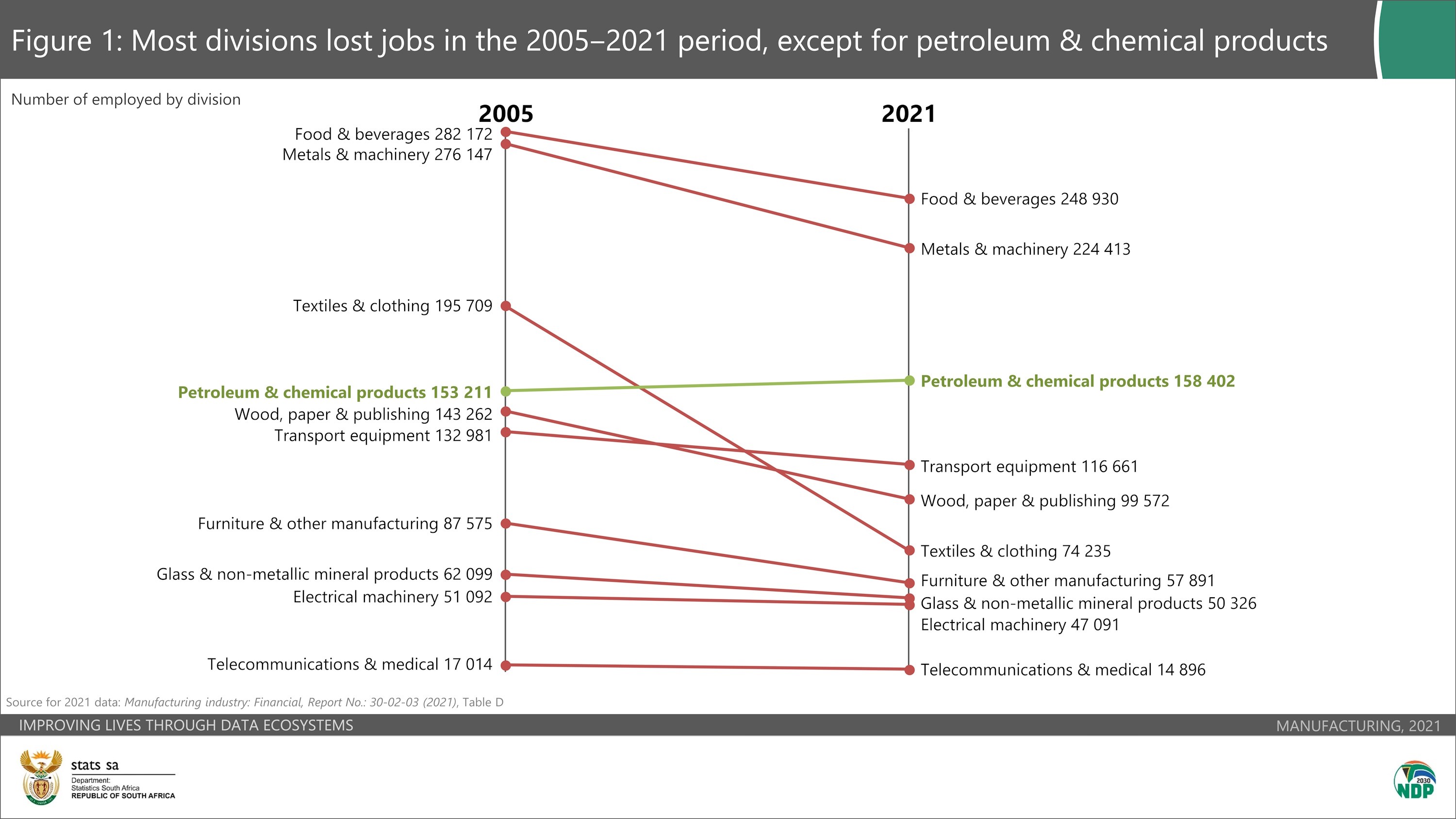 The survey1 was previously conducted in 2005, 2008, 2011, 2014 and 2017, creating a valuable time series. A key trend in the data is the decline of manufacturing jobs. In 2005, the industry employed 1,40 million individuals. In 2017, 1,18 million were employed, declining to 1,09 million in 2021. The industry has lost almost 309 000 jobs over a 16-year period, with the decline in 2021 most likely the result of the COVID-19 pandemic.