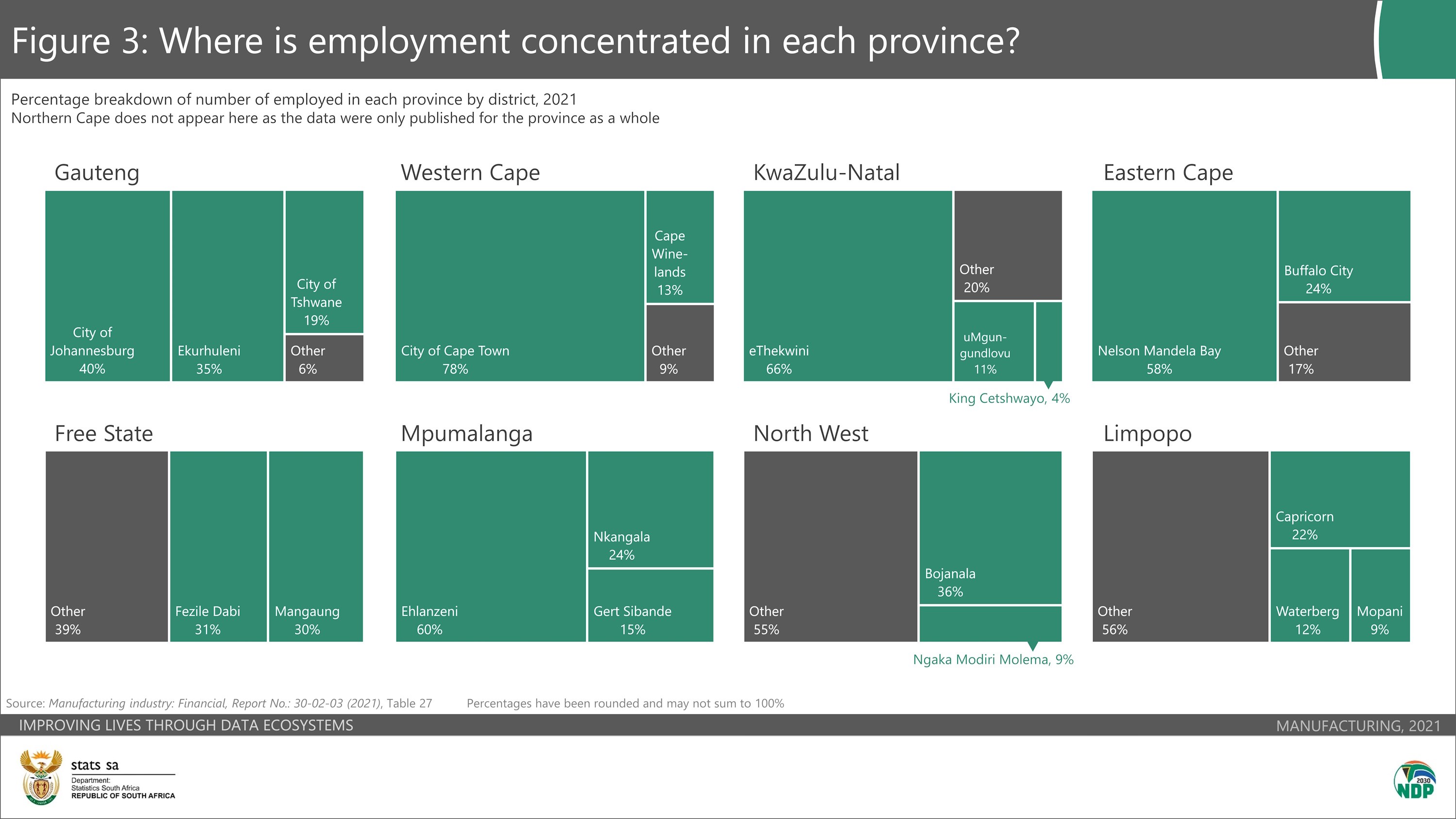 Manufacturing is mainly concentrated in the City of Johannesburg, Ekurhuleni, the City of Cape Town and eThekwini. In 2021, the four cities accounted for 60% of the national workforce and just over half of sales of goods & services.