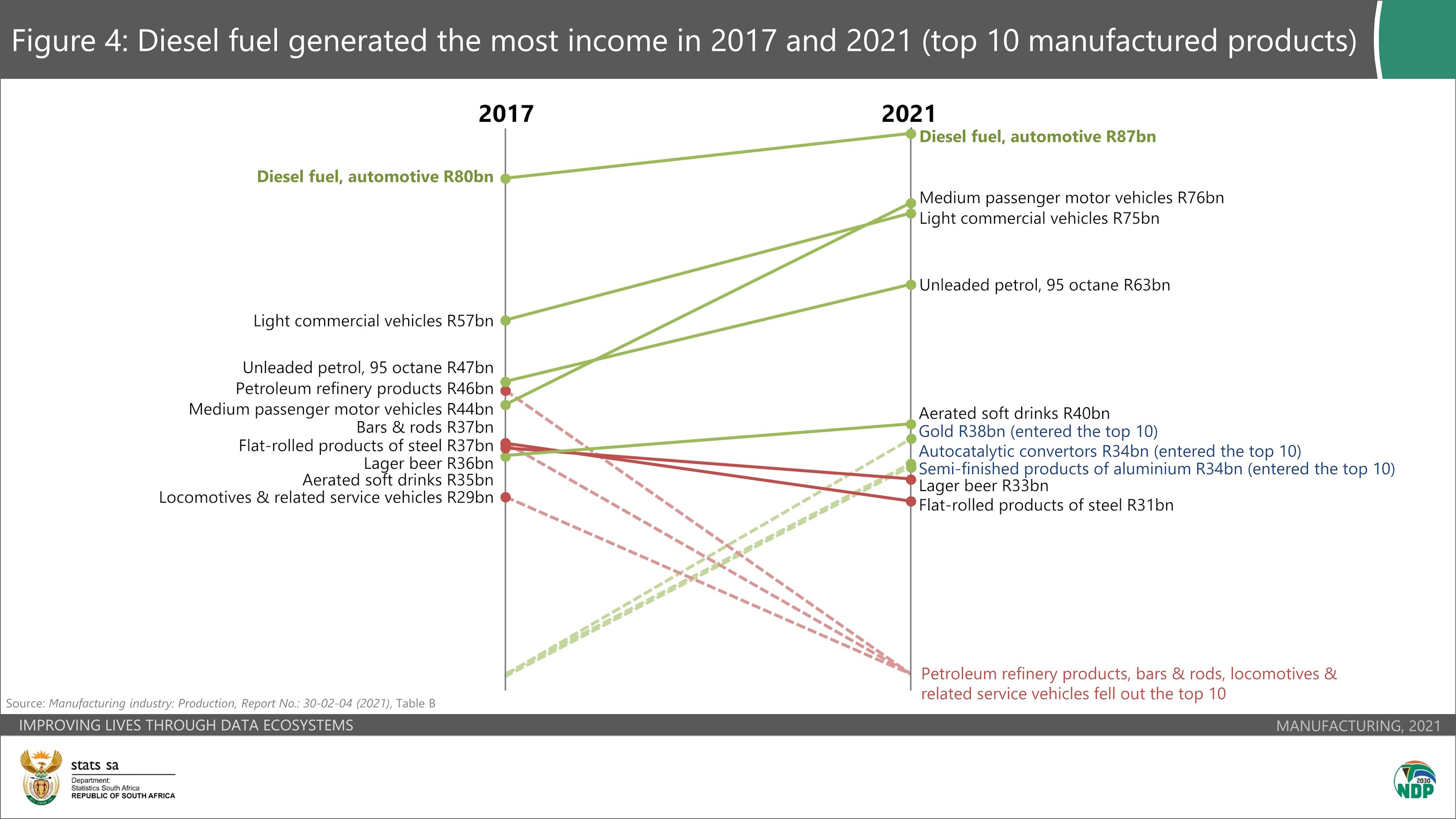 In 2021, the top ten manufactured products that generated the most income were related to the automotive, beverage and steel sectors. More specifically, diesel fuel generated the most income in 2017 and 2021 (Figure 4). The industry also recorded a rise in income from several other products, including medium passenger motor vehicles and light commercial vehicles.