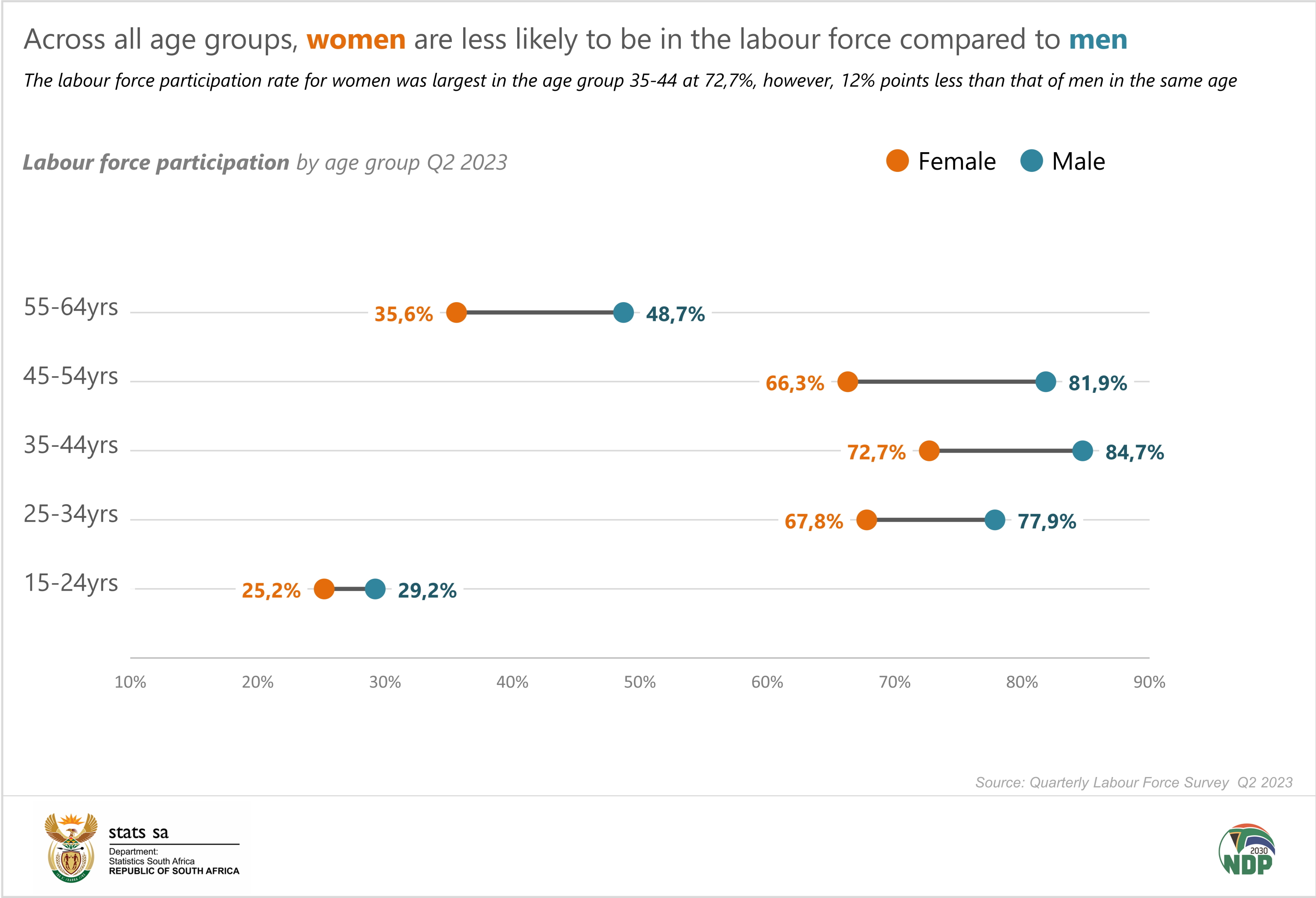In Q2:2023 the labour force participation rate was highest among South Africans aged 35 to 44 years (78,8%); young people aged 15-24 had the lowest labour force participation rate at 27,2%. The labour force participation rate for women was largest in the age group 35-44 at 72,7%; this, however, is 12 percentage points less than that of men in the same age group. Across all age groups, women are less likely to be in the labour force compared to men. The largest labour force participation gap was in the age group 45-54 at 15,5 percentage points. Female labour force participation showed an increase in all age groups between Q2:2022 and Q2:2023.