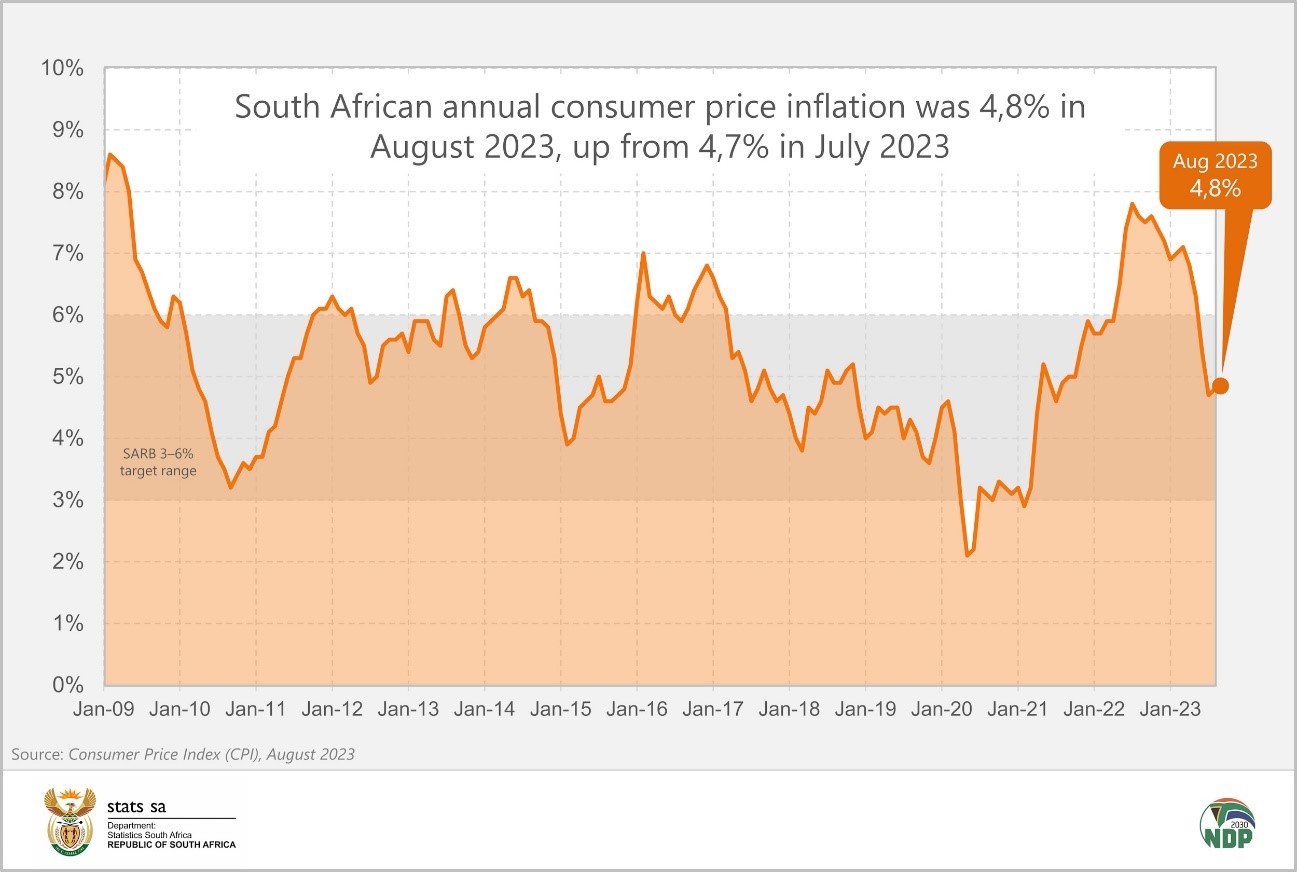 After four consecutive months of decline, annual consumer inflation pushed up in August, rising to 4,8% from 4,7% in July. Inflation for food & non-alcoholic beverages (NAB) continued to cool, taking some of the heat off the headline rate. This was not enough, however, to counteract a rise in fuel prices and increases in municipal tariffs.