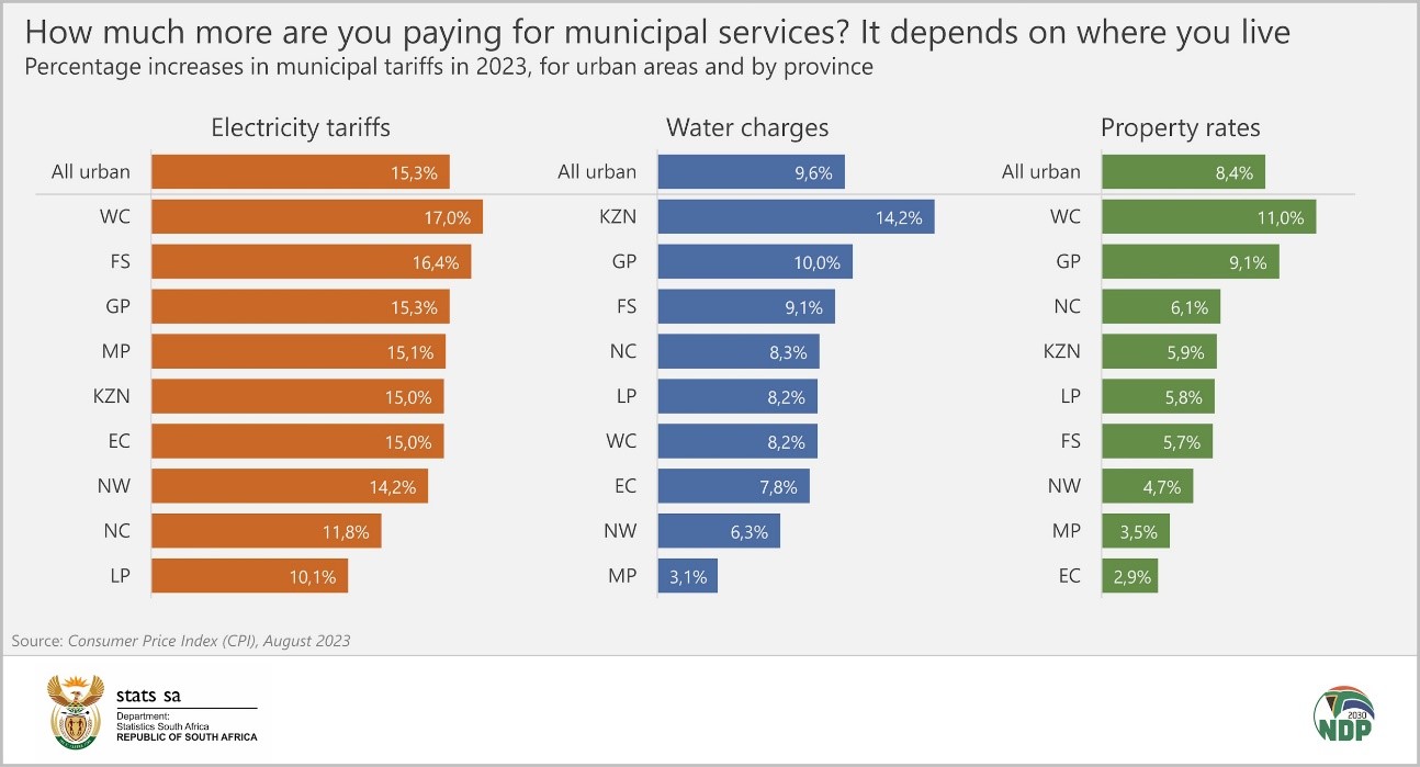 In 2023, Western Cape residents experienced the biggest increases in both electricity tariffs (up 17,0%) and property rates (up 11,0%). Residents in KwaZulu-Natal recorded the largest rise in water charges (up 14,2%), followed by Gauteng (up 10,0%).