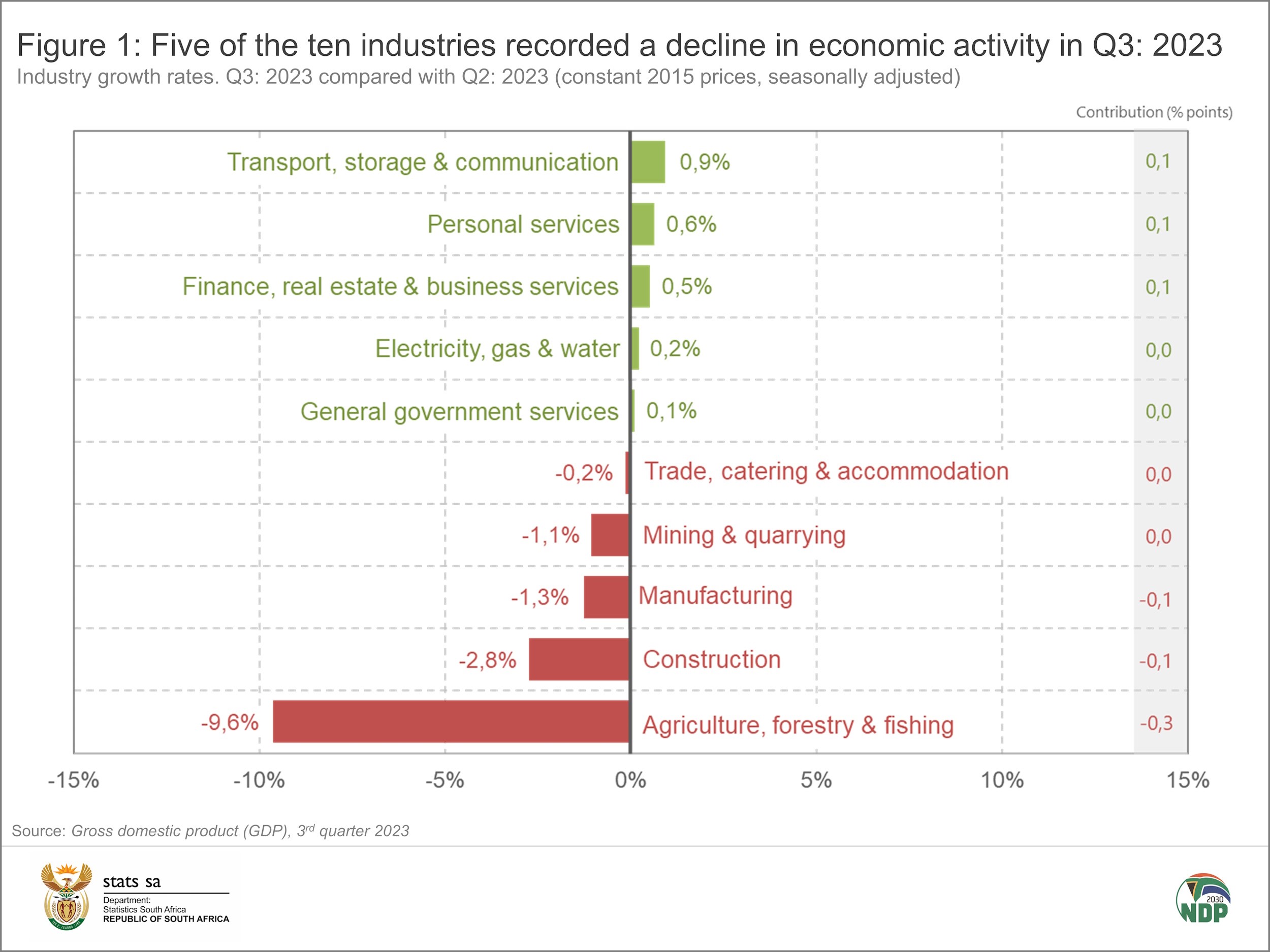After two consecutive quarters of growth, South African real gross domestic product (GDP) contracted by 0,2% in the third quarter (July–September) of 2023.1 The contributions to the performance of the economy were evenly spread between the industries on the production side of the economy. The contributions ranged from -0,3 of a percentage point to +0,1 of a percentage point.