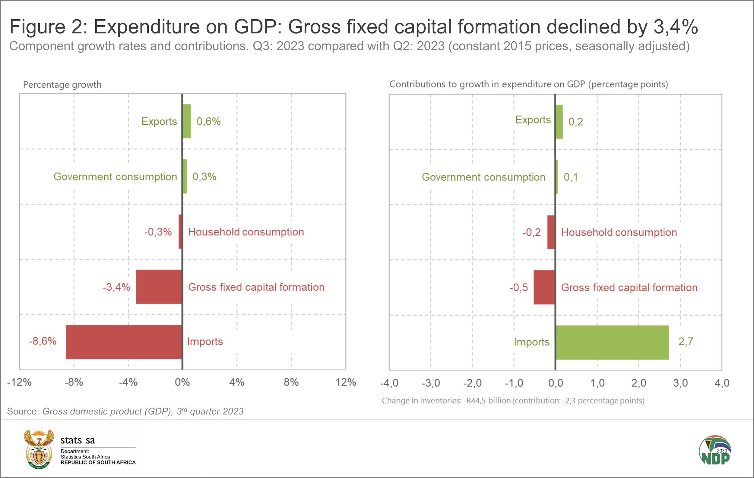 Stats SA also measures the expenditure side of GDP, providing an indication of total demand in the economy. This includes measures of government consumption, household consumption, investment (gross fixed capital formation and changes in inventories), and net exports.