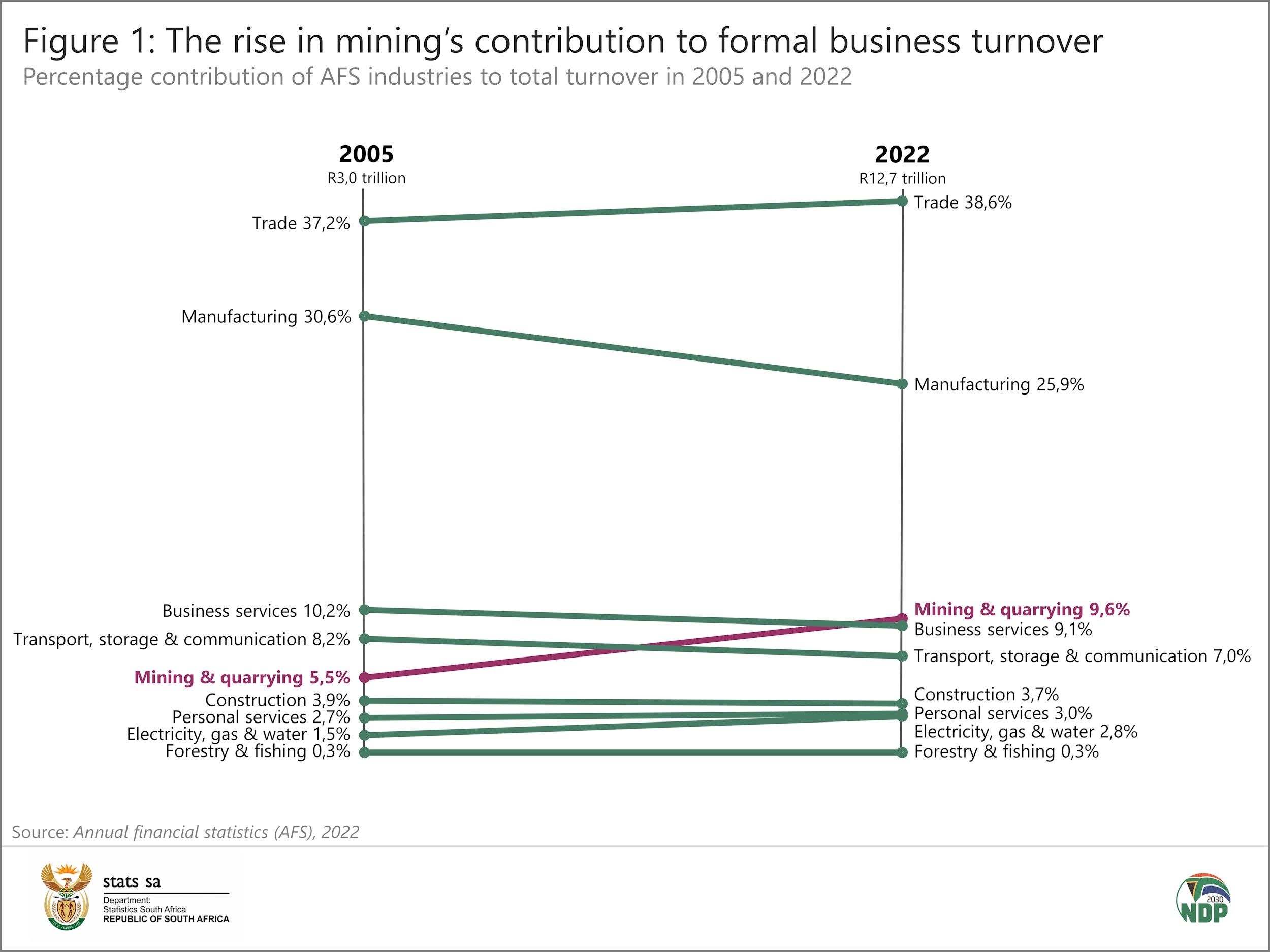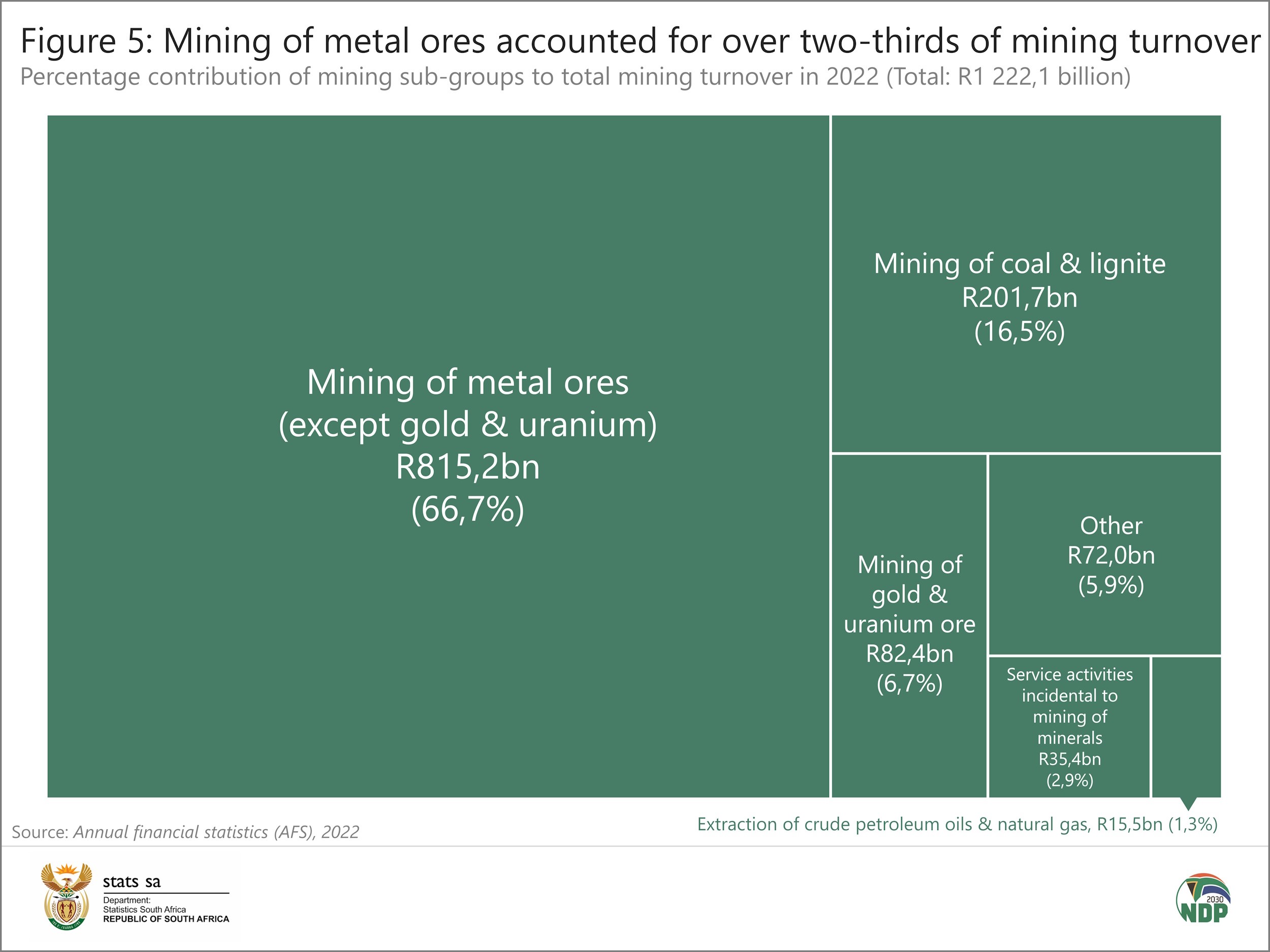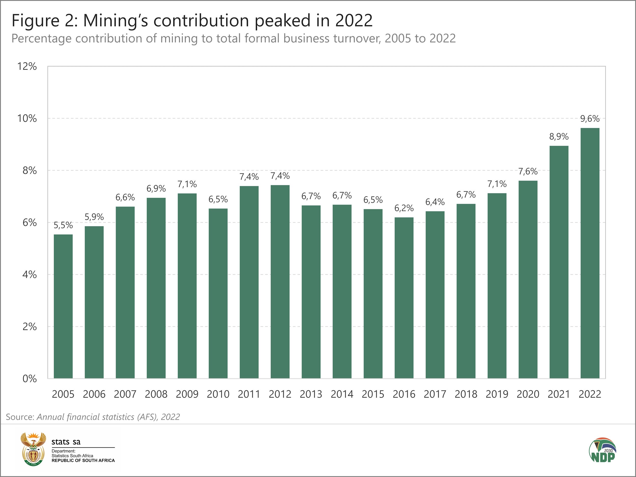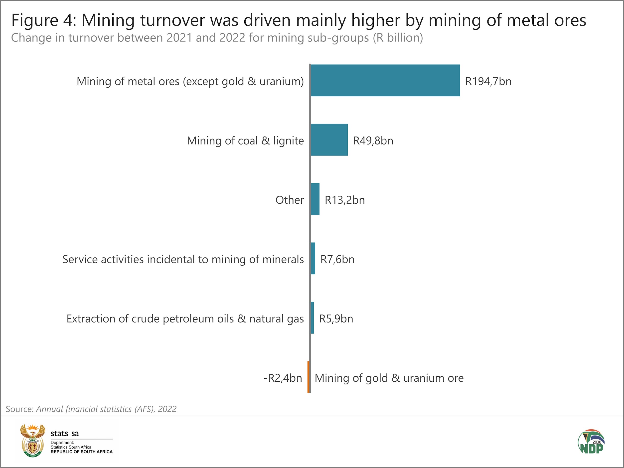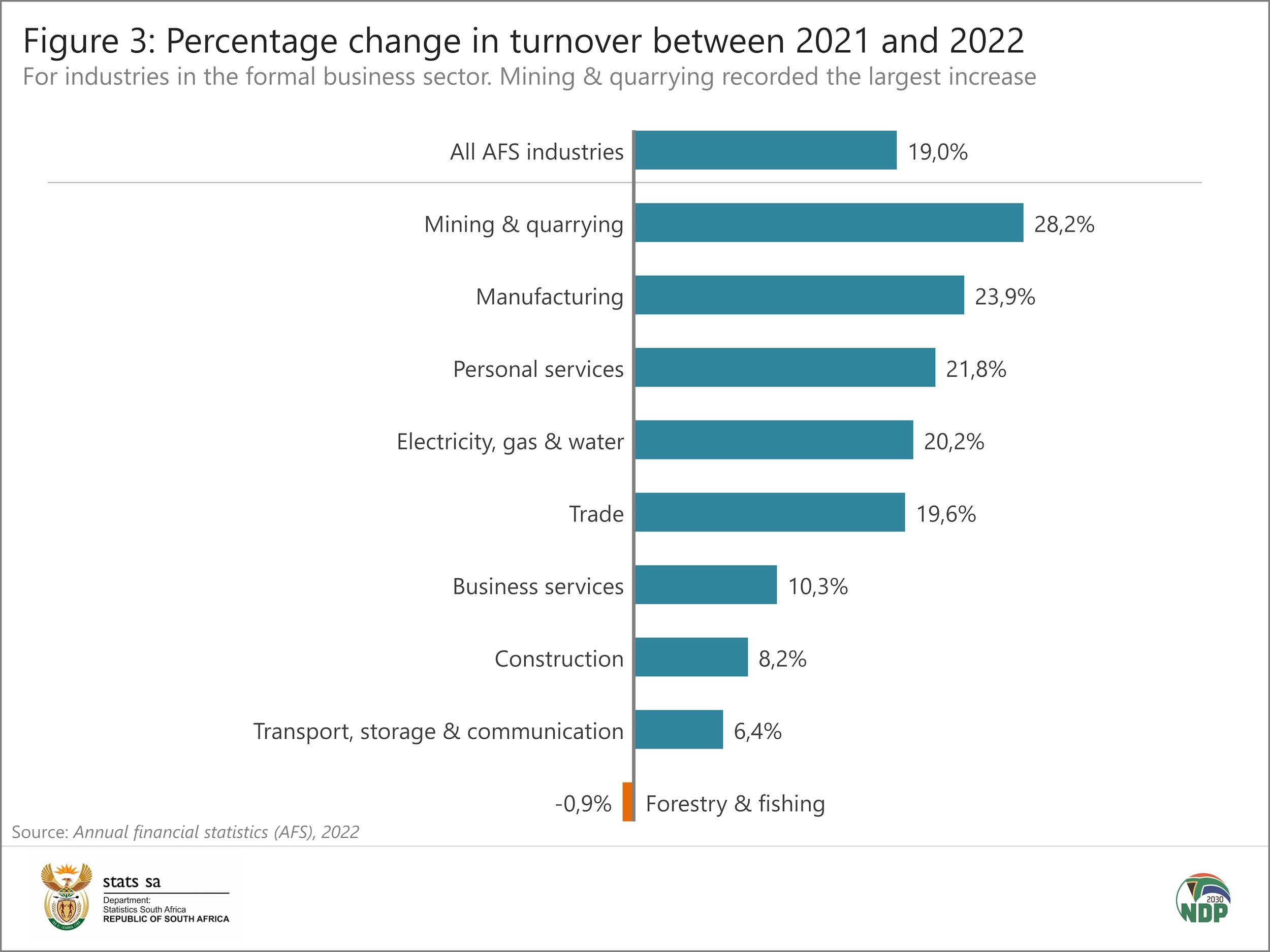 In 2022, mining turnover rose by 28,2%, the largest percentage increase among the nine industries surveyed by the AFS (Figure 3). This represents a rise of R268,8 billion from R953,3 billion in 2021 to R1 222,1 billion in 2022.